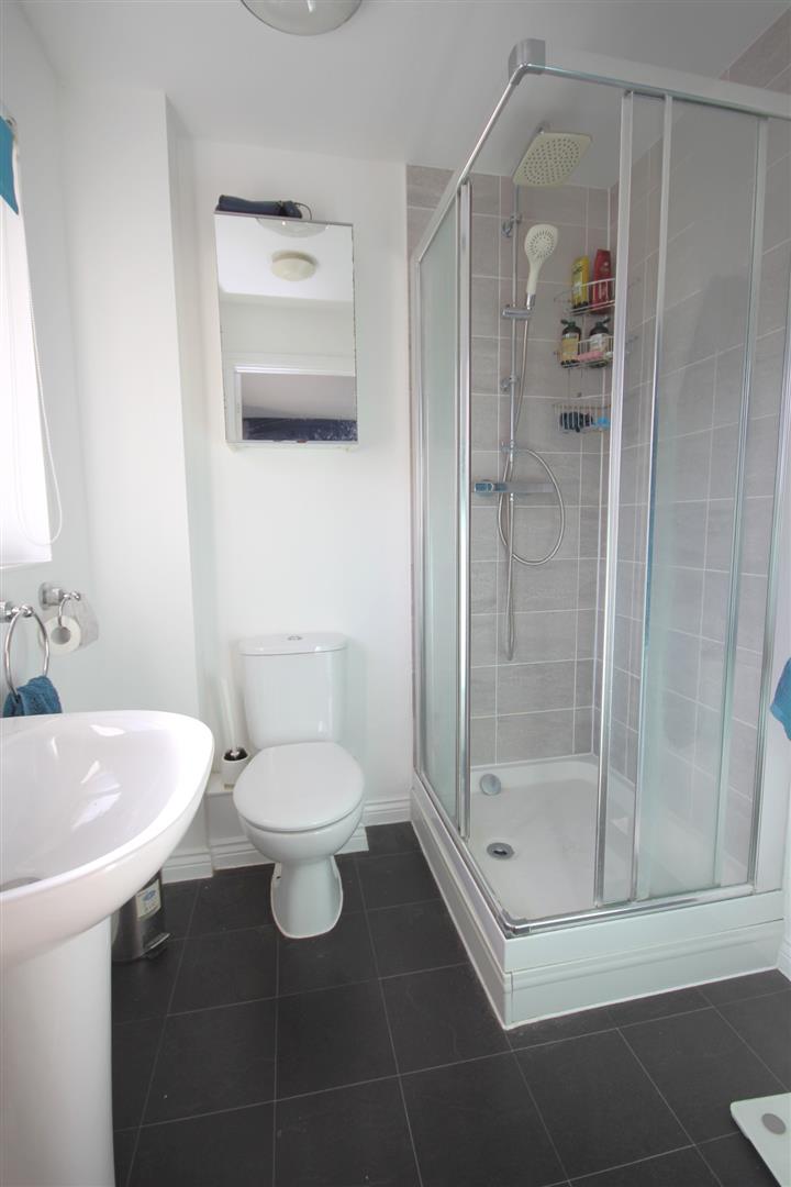 Modern en-suite shower room comprising three piece white suite & attractive wall tiling