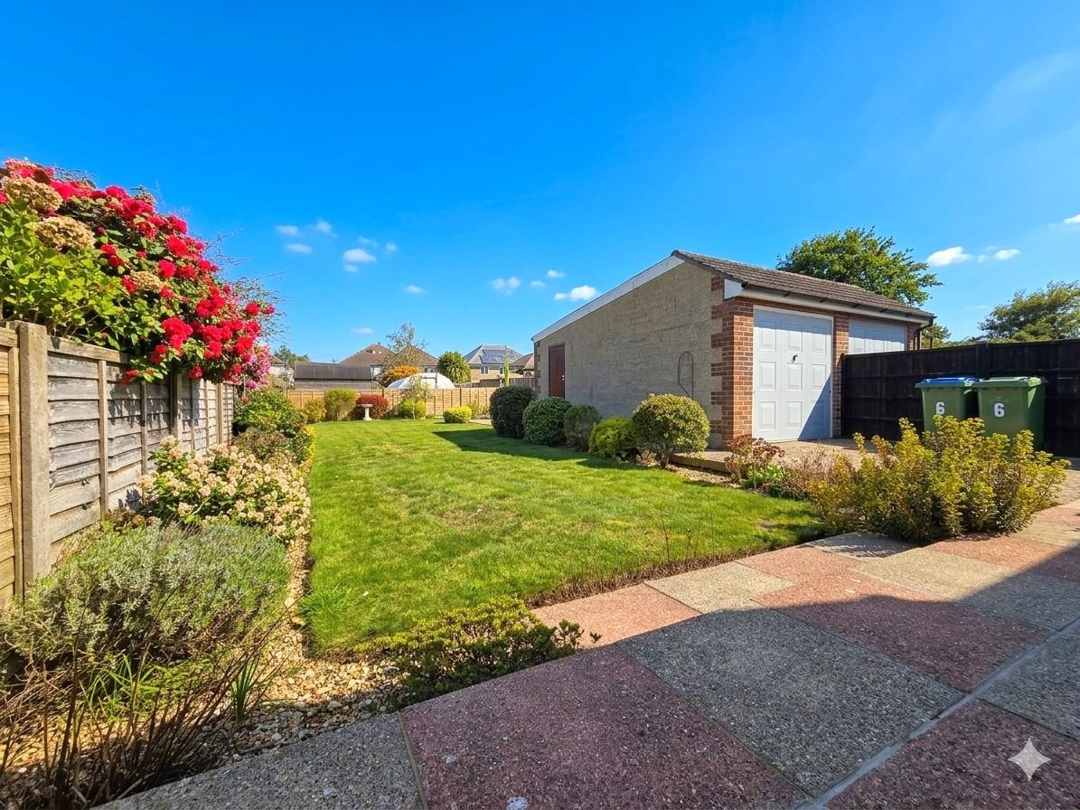 Southerly facing impressively sized 73x31 ft landscaped garden majority laid to lawn with display flower/shrubbery & paved patio