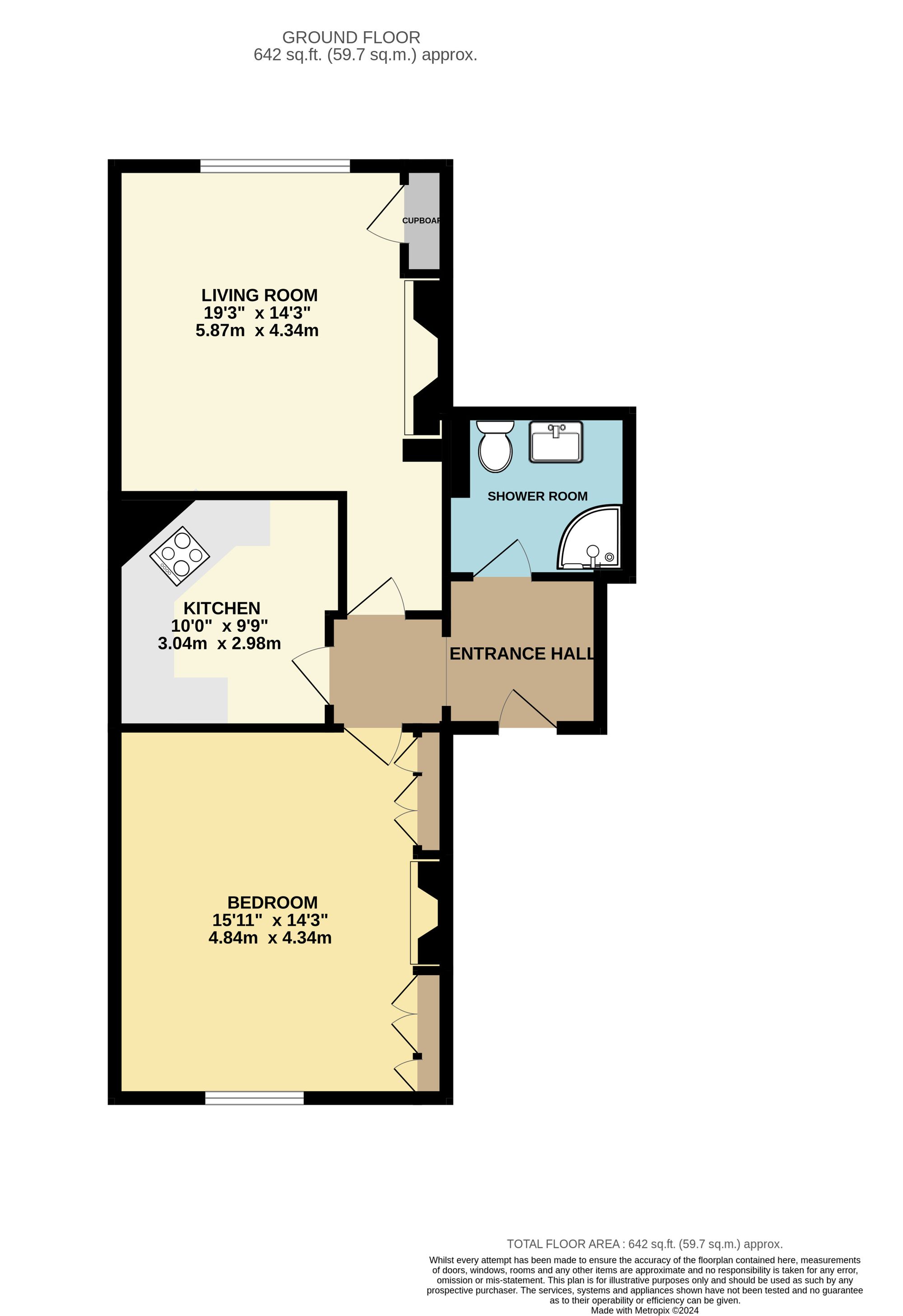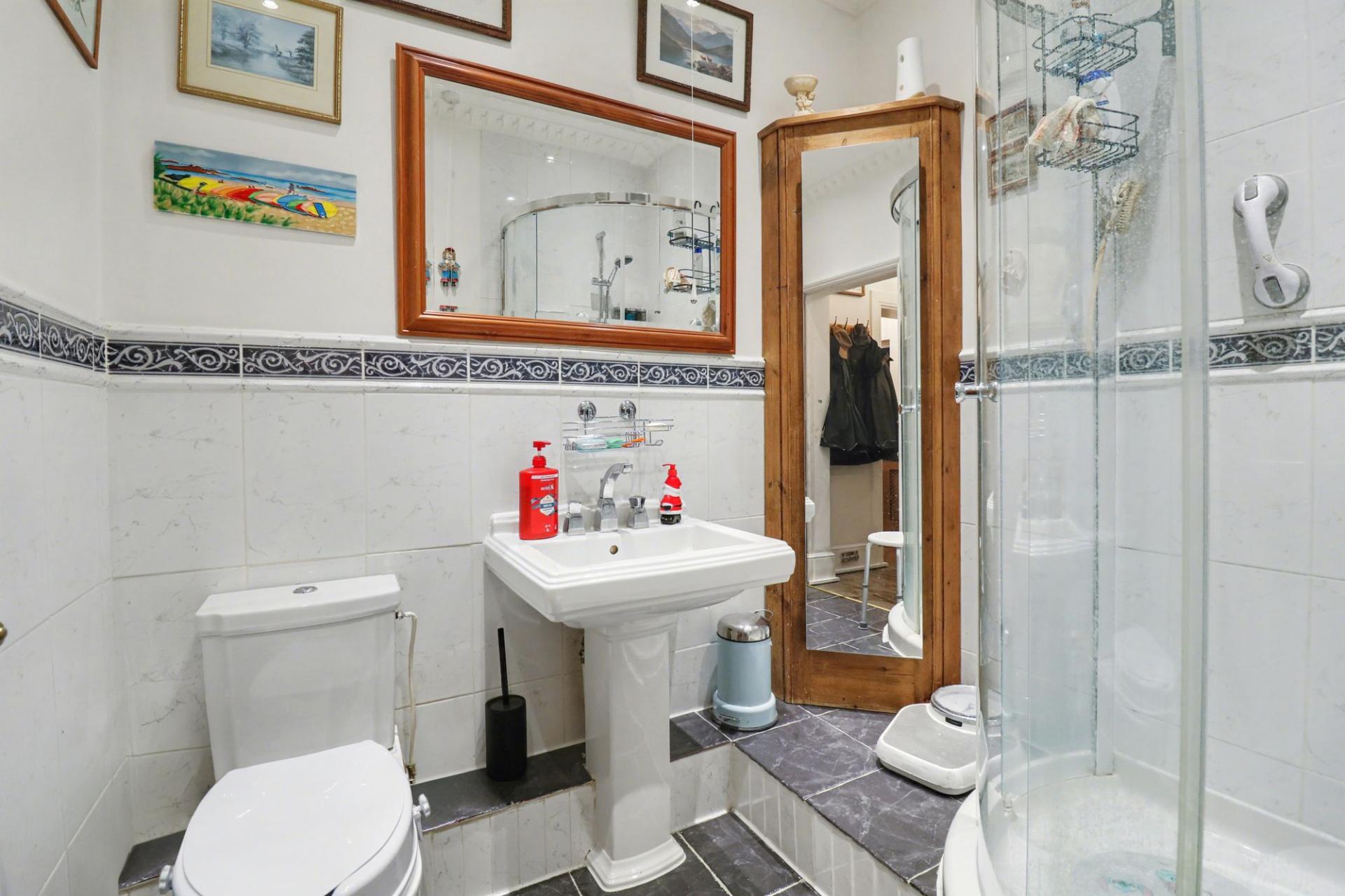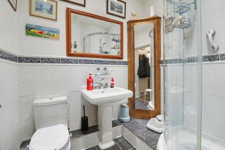 The shower room has been fitted with a white suite, comprising a shower cubicle, wash hand basin, WC, extractor fan and a fitted, corner storage cupboard.
