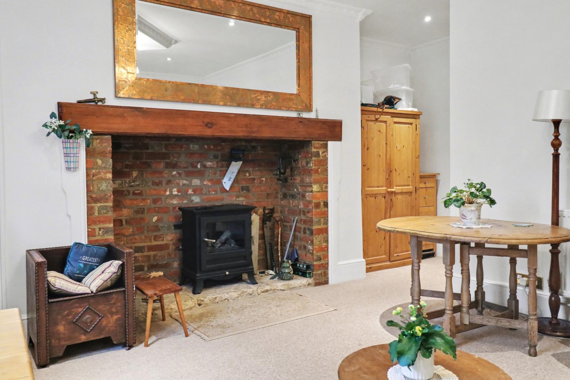 The entrance hall has doors through to all accommodation, including the spacious lounge which has a window overlooking the rear, a built-in cupboard housing the boiler and a beautiful, inglenook fireplace with inset electric wood burner.