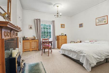 The large, double bedroom has a window to the front aspect and traditional style, fitted wardrobes either side of the feature fireplace, which has a hidden TV unit which rises from the mantel piece.