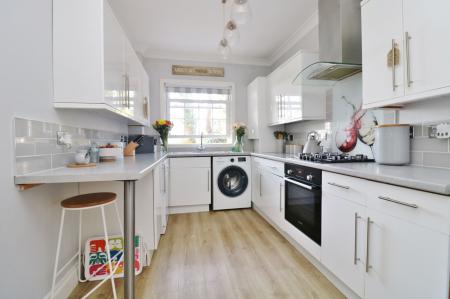 The kitchen has been fitted with a modern range of white wall and base units with a built-in electric oven and gas hob with extractor over and a breakfast bar to one side. There is a double glazed sash style window to the rear and appliance space for a free-standing fridge/freezer, dishwasher and washing machine.
