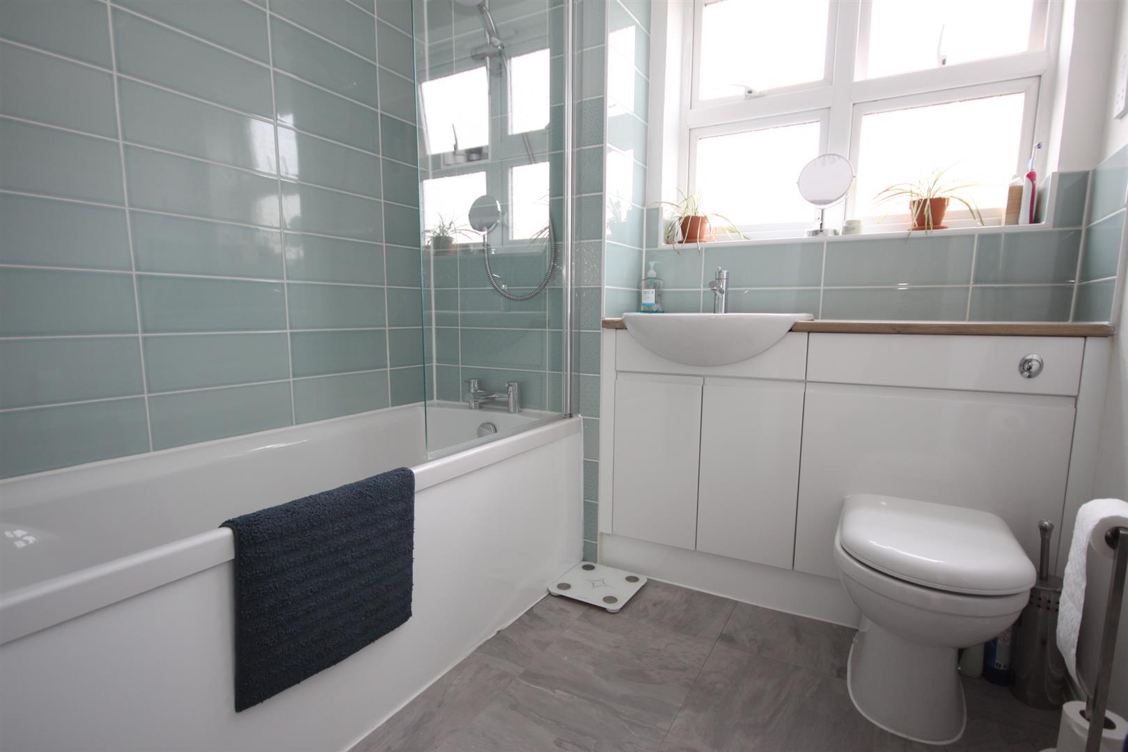Modern bathroom comprising three piece white suite & attractive wall tiling