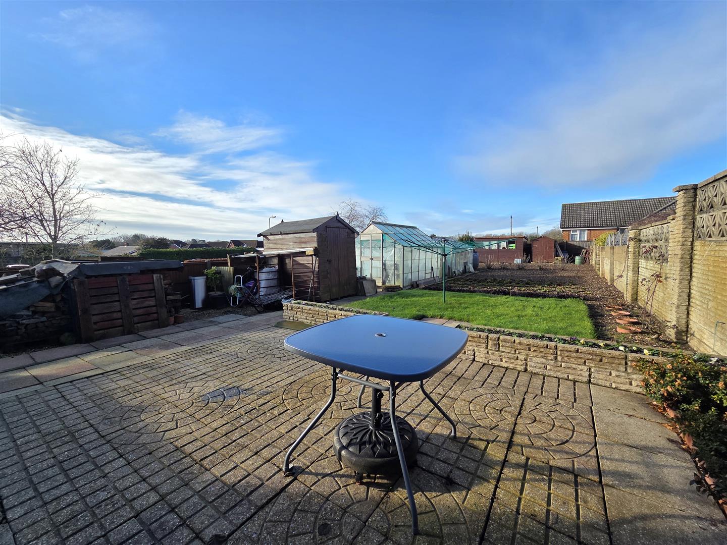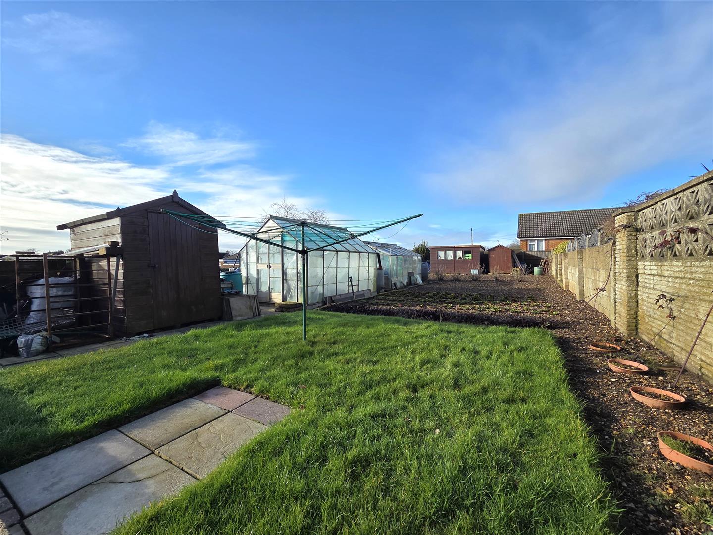 Impressively sized westerly facing rear garden laid to paved patio, lawn, flower/fruit & vegetable patches with multiple outbuildings to remain