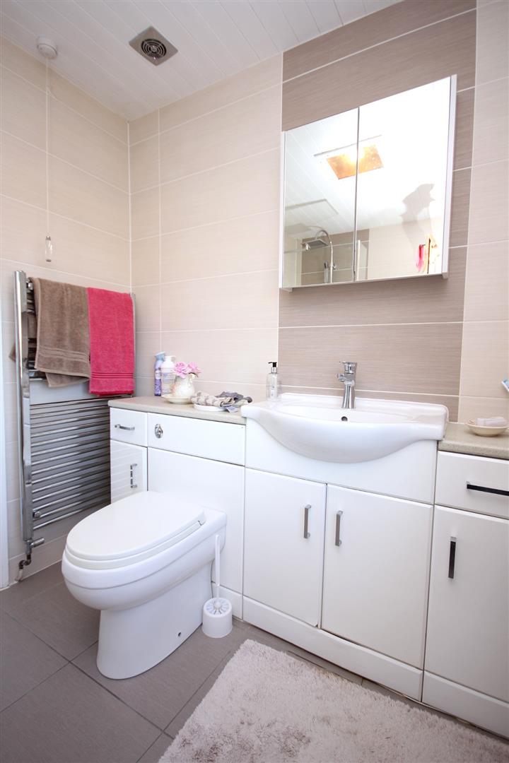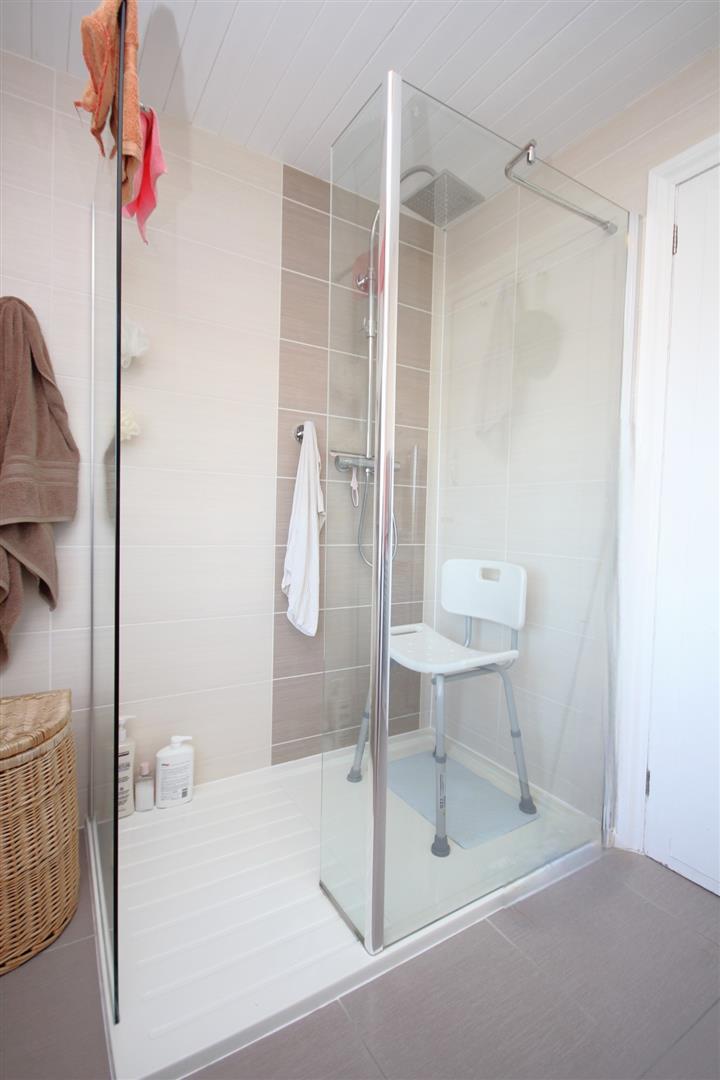Modern re-fitted shower room comprising three piece white suite with feature low profile shower cubicle & attractive wall/floor tiling