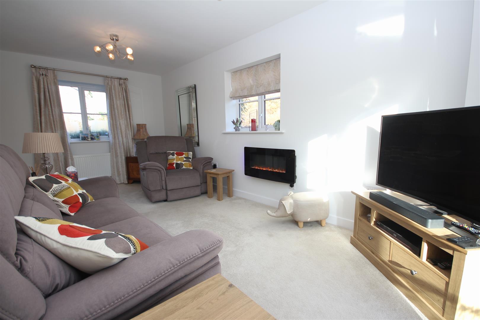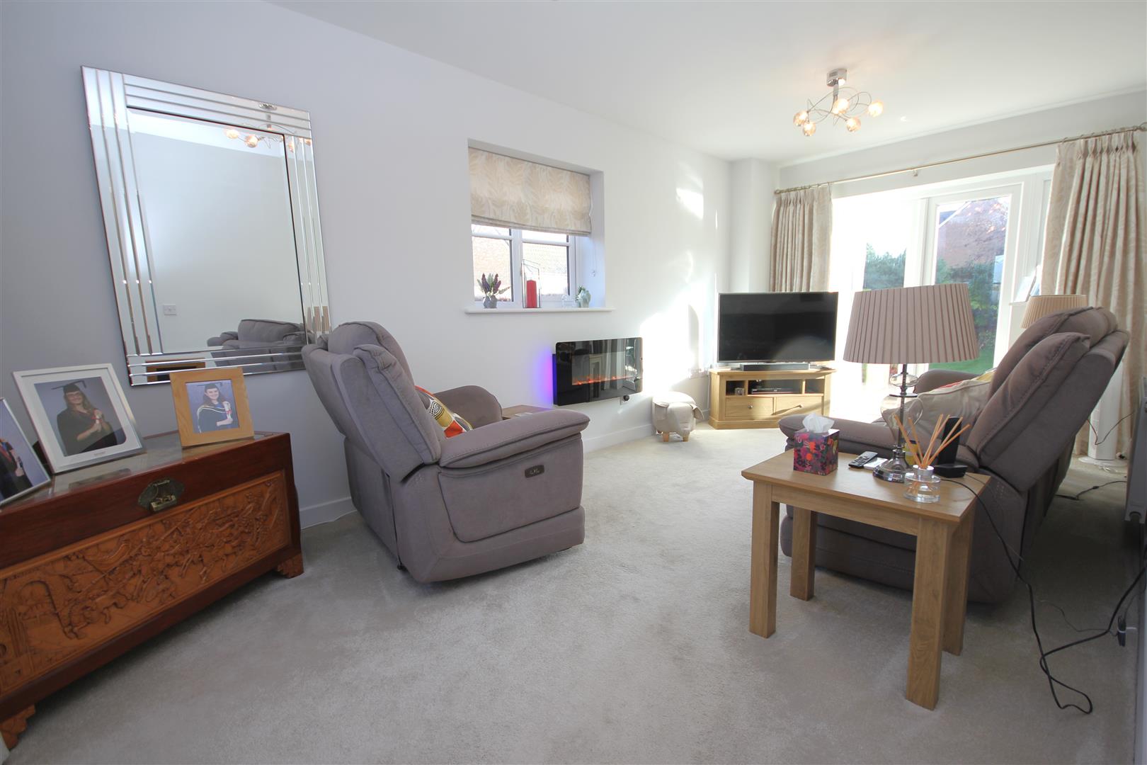 Triple aspect lounge with double doors opening out to the rear garden & centrepiece contemporary electric remote controlled fire