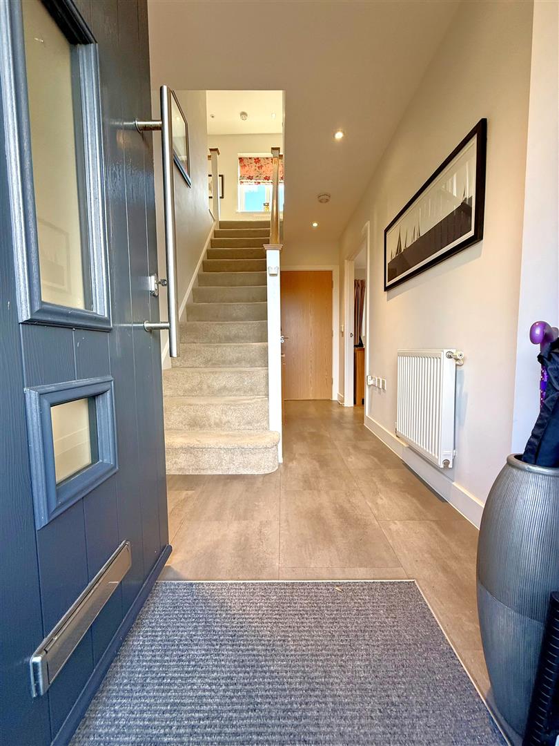 Welcoming entrance hall enjoying attractive tiled flooring flowing into the kitchen/dining room, downstairs cloakroom & built in understairs storage cupboard