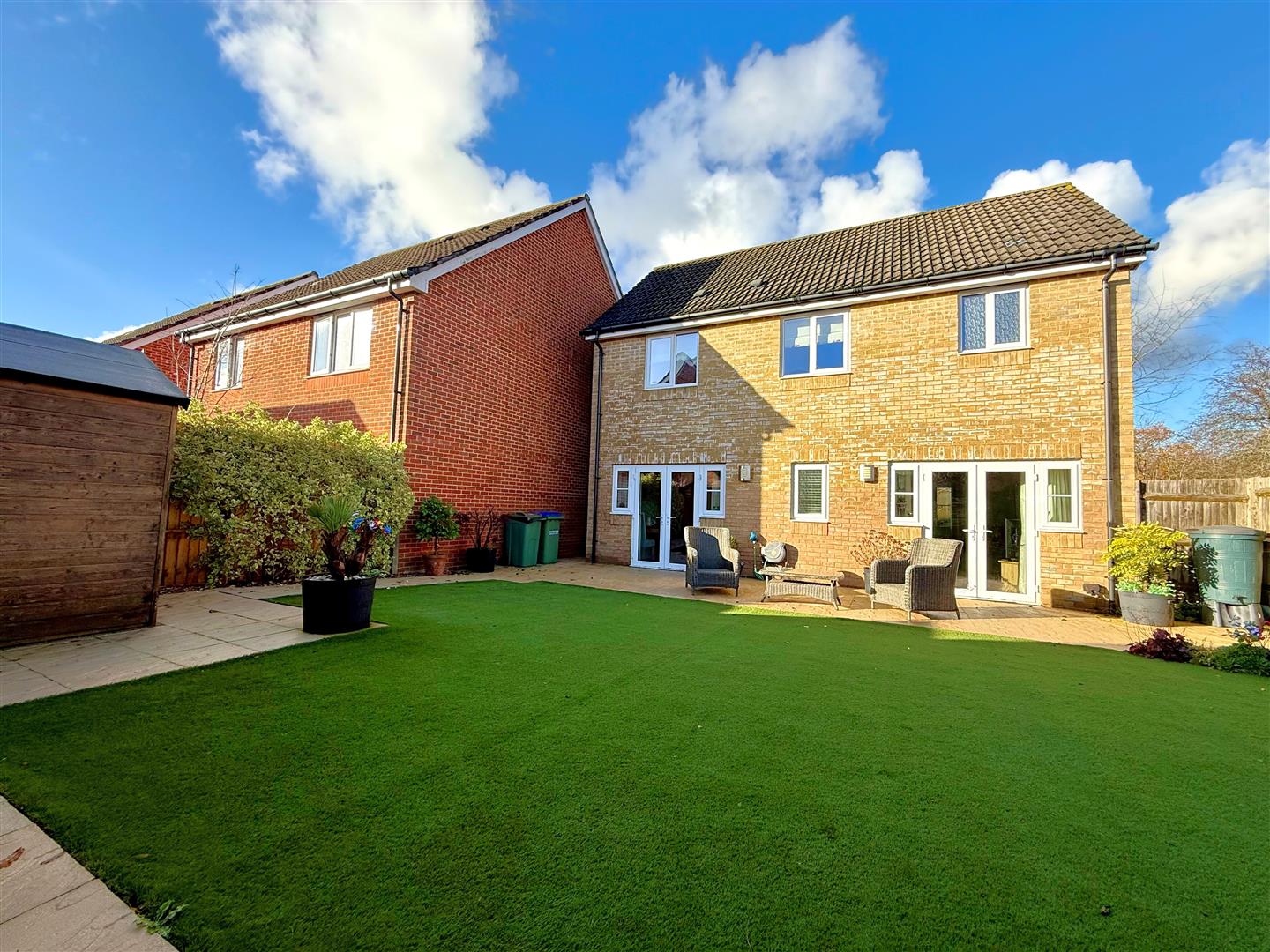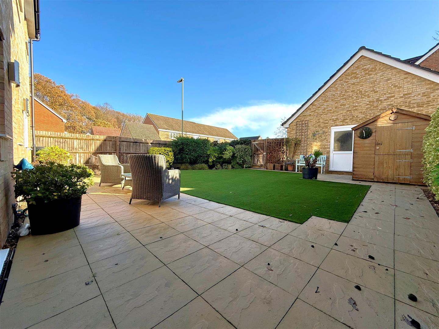 Landscaped rear garden enjoying paved patio areas, artificial lawn with display shrubbery/flowers & shed to remain