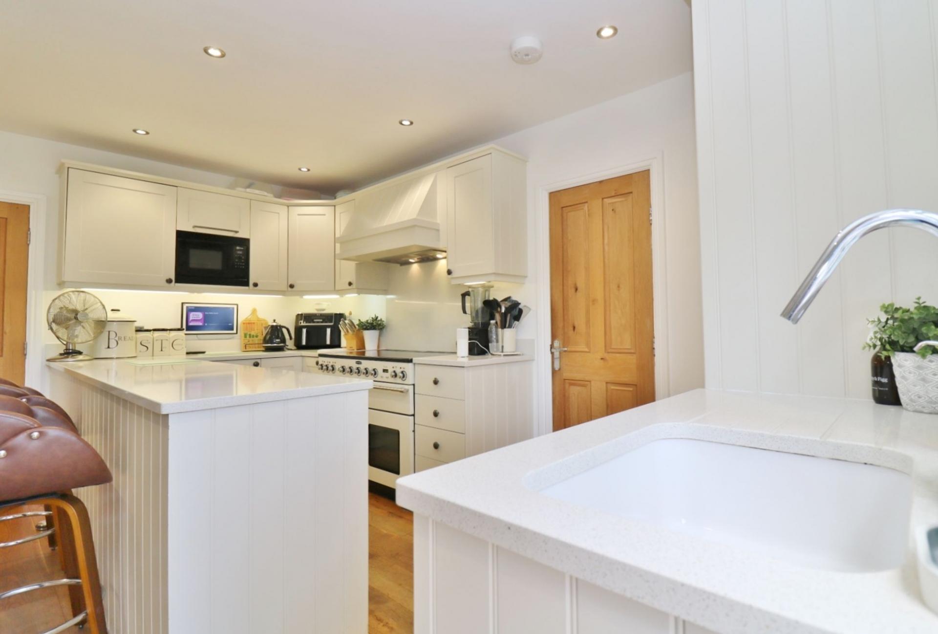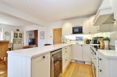 The dining room is open plan to the beautiful kitchen which has been fitted with a modern range of shaker style wall and base units with Corian worktops and a space for a Range Master cooker (not included) with extractor hood over. There is a window and door to the rear and integrated appliances including a fridge, slimline dishwasher and a microwave.