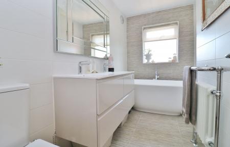 The modern family bathroom has a free-standing bath, twin wash hand basins set in a vanity unit, WC and a window to the rear aspect.