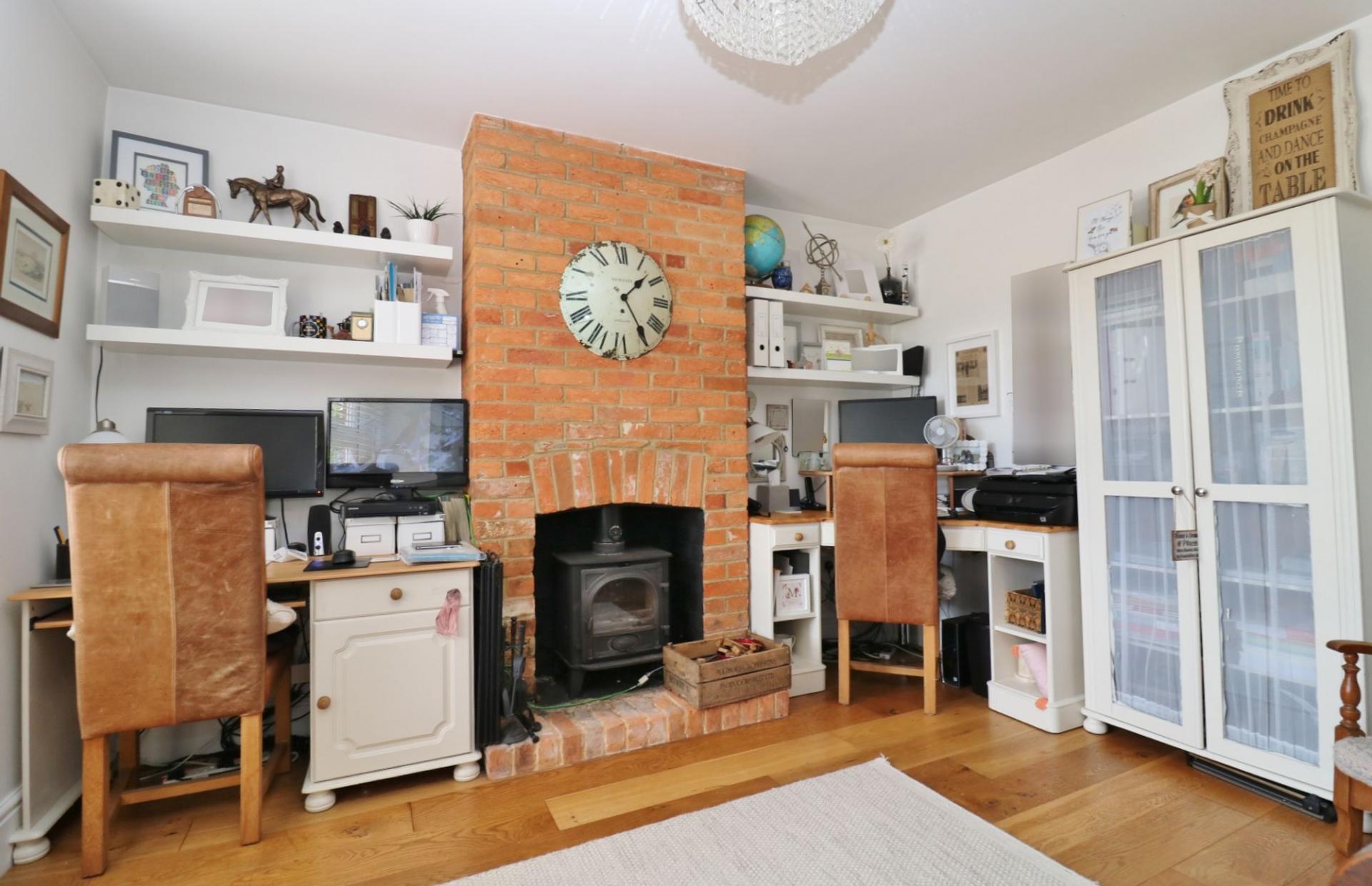 The entrance hall has stairs to the first floor and engineered oak flooring which continues through to the lounge, dining room, kitchen and reception room/fourth bedroom, which has windows to the front and an exposed brick fireplace with a wood burning stove.