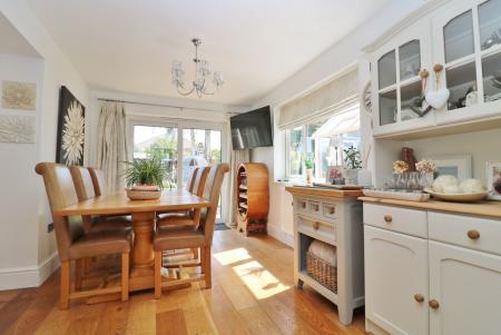 The lounge also enjoys windows to the front and an exposed brick fireplace with inset wood burning stove. An opening leads through to the dining room which has a window to the side and sliding patio doors leading out to the rear garden.