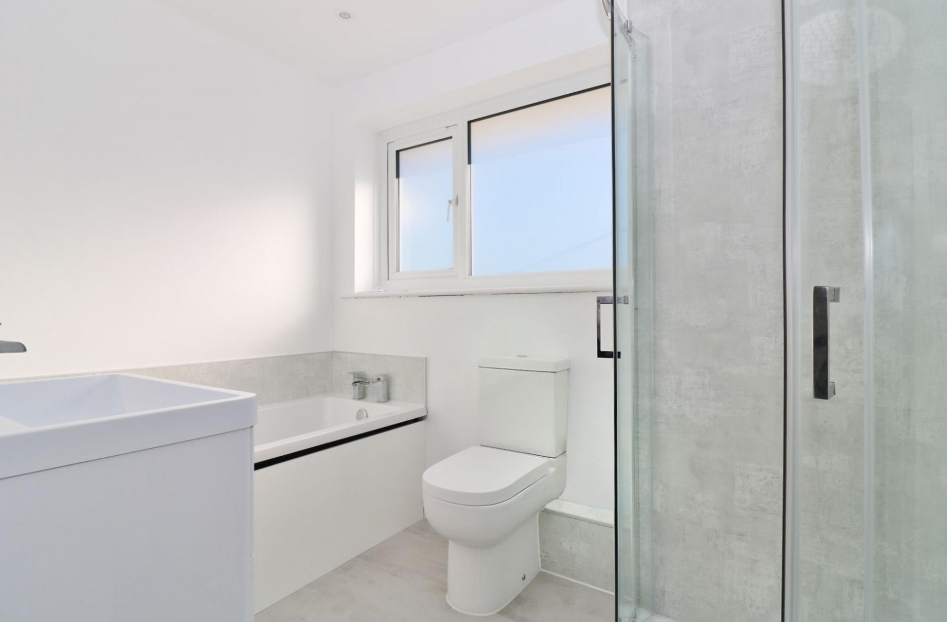 The stylish family bathroom comprises a corner shower cubicle, panel enclosed bath, vanity wash hand basin, WC and a window to the front.