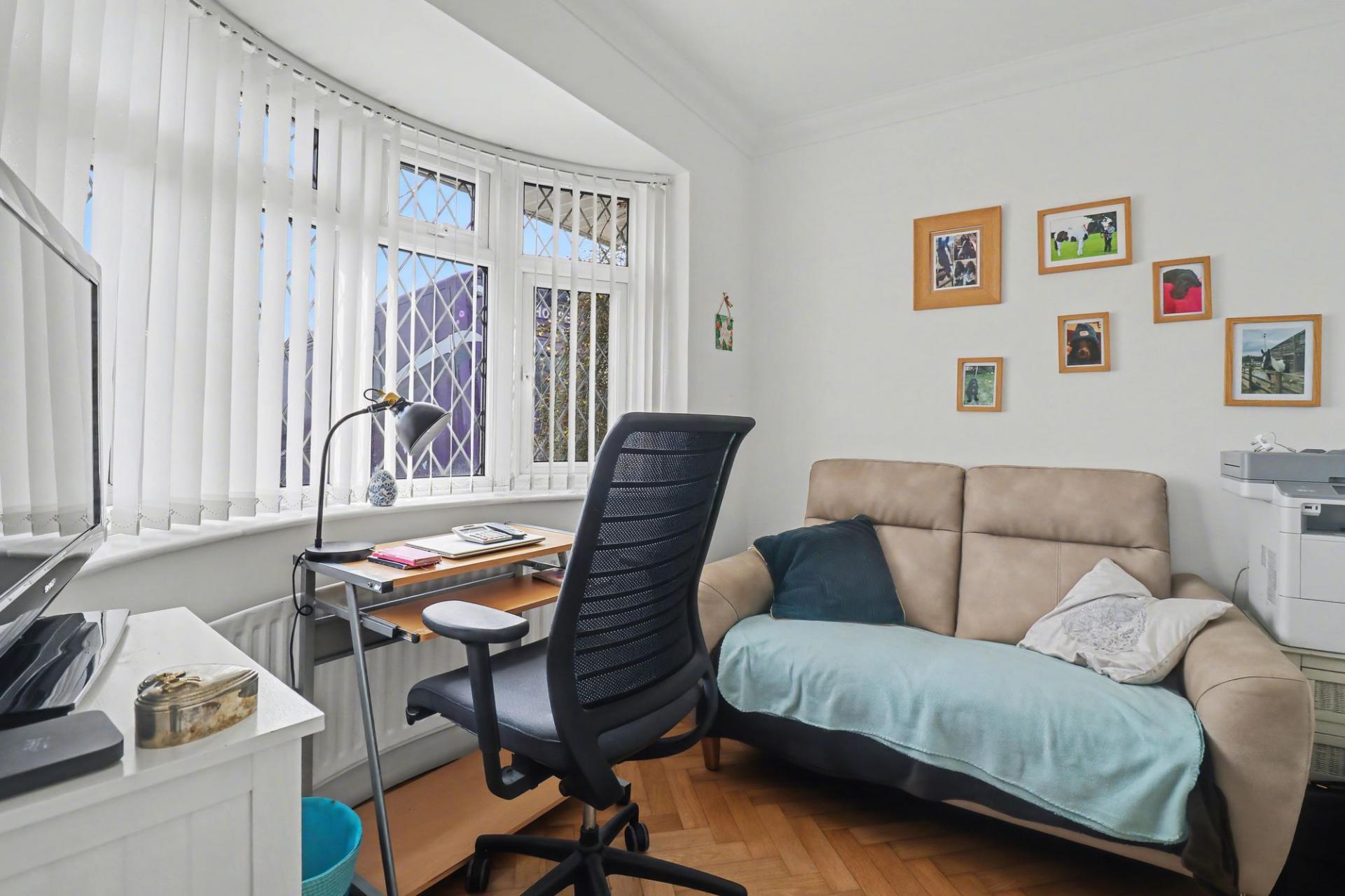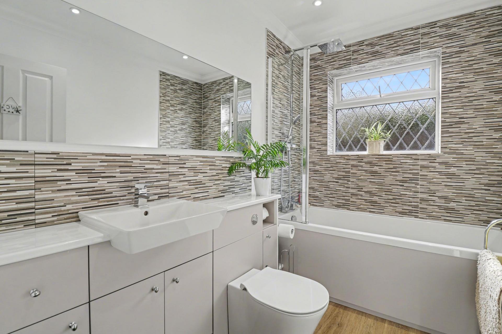 The stylish family bathroom has a panel enclosed bath with shower over, vanity wash hand basin, WC and a window to the side. The third bedroom is also located on the ground floor and has a bay window to the front aspect.