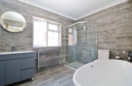 The spacious, contemporary bathroom comprises a free-standing bath, corner shower cubicle, vanity wash hand basin, WC, heated towel rail and a window to the side.