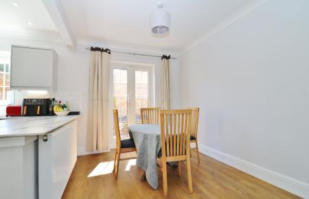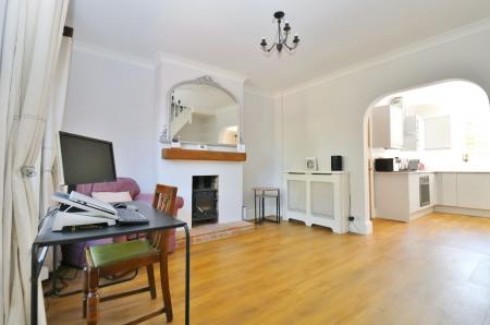The kitchen is open plan to the dining area which has French doors to the rear garden and wraps around to the lounge, which has a feature fireplace to one wall and a window to the front.