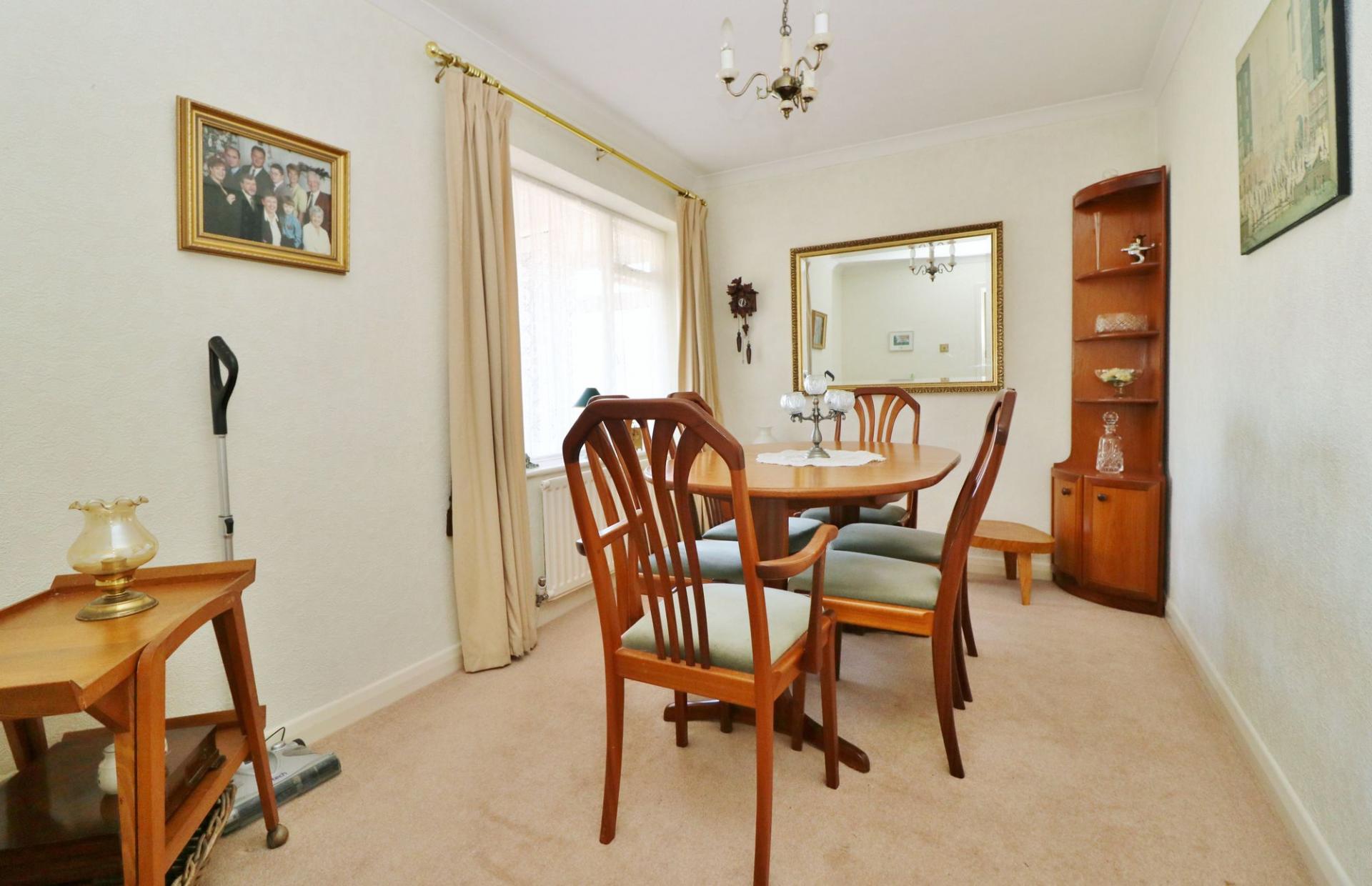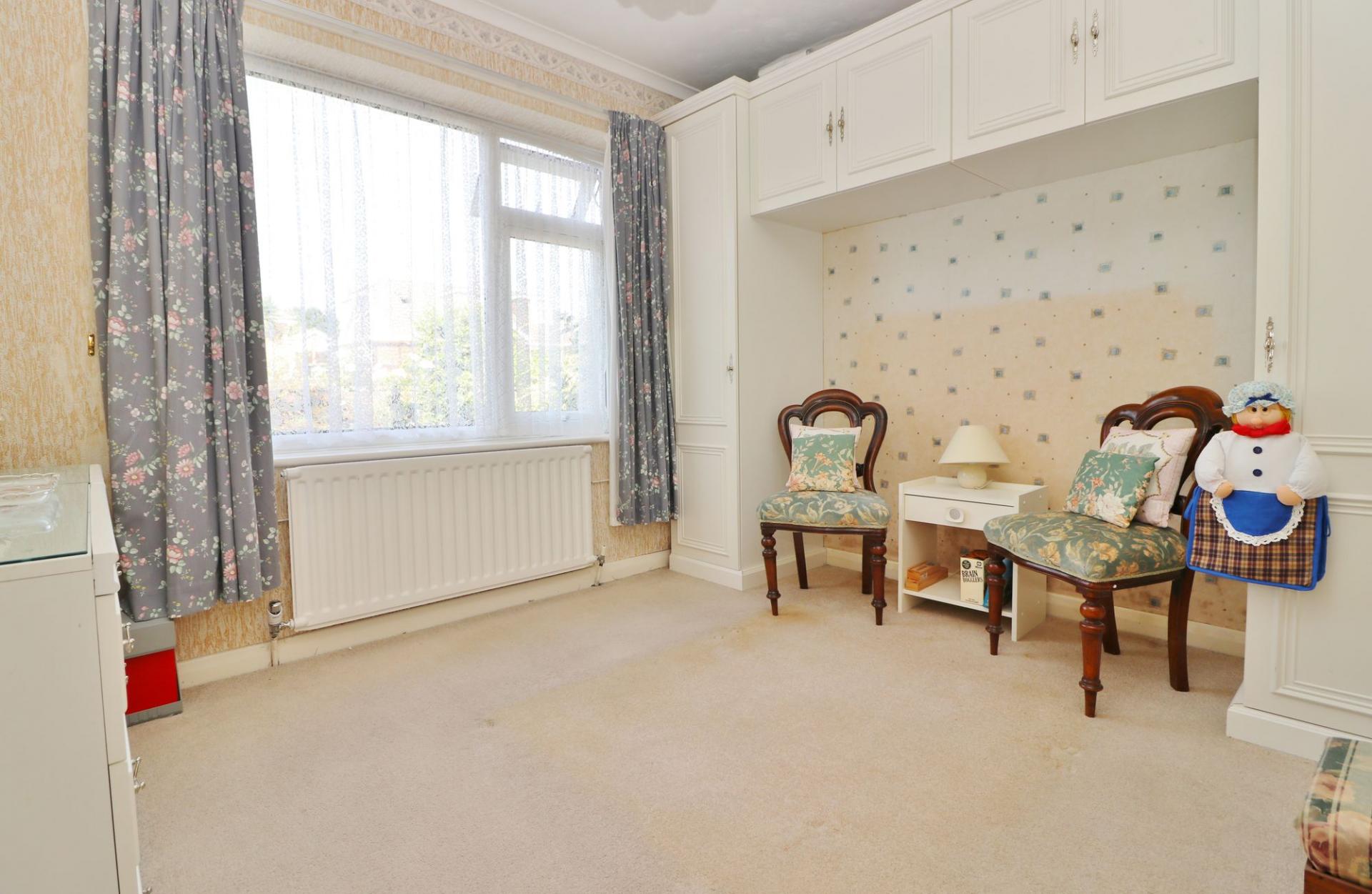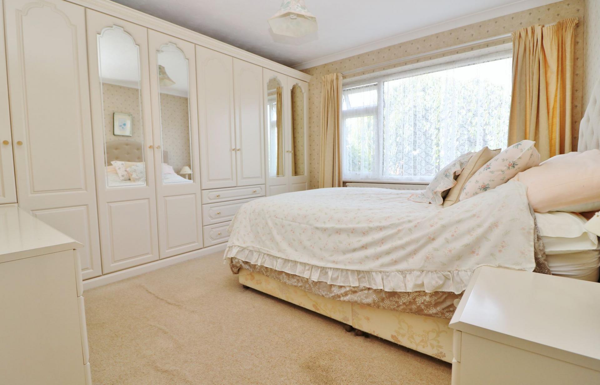 The good size master bedroom has a window to the front and fitted wardrobes along one wall. Bedroom two also faces the front and has fitted wardrobes and cupboards, whilst the third bedroom (which is currently being used as dining room), has a window facing the front porch.