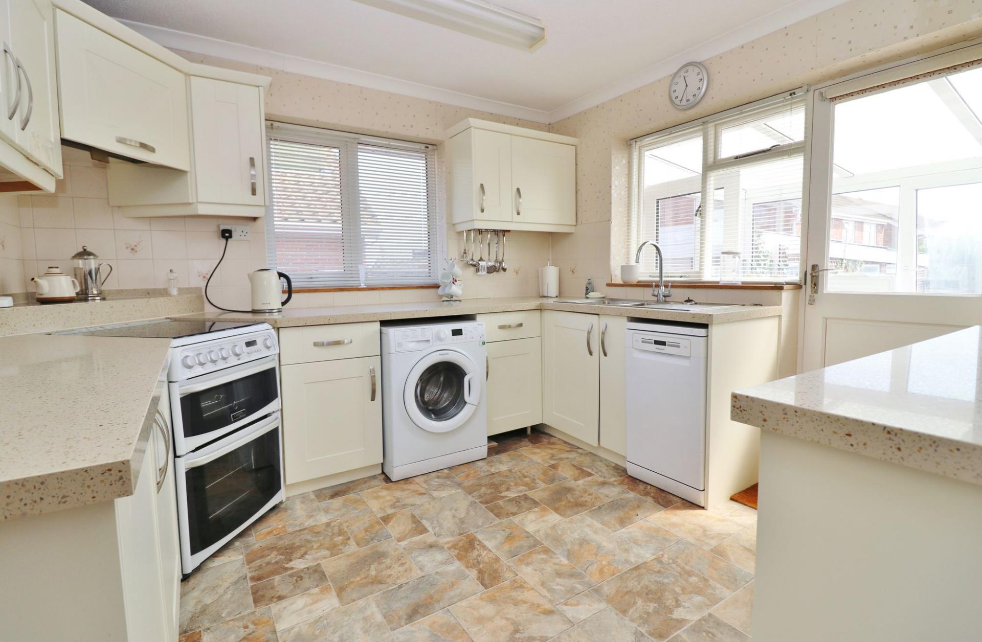 The dual aspect kitchen has been fitted with a modern range of shaker style wall and base units with an integrated, under counter fridge and freezer, as well as appliance space for a free-standing cooker, dishwasher and washing machine.
