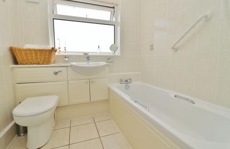 The modern bathroom comprises a panel enclosed bath, vanity wash hand basin, WC and a window to the rear.