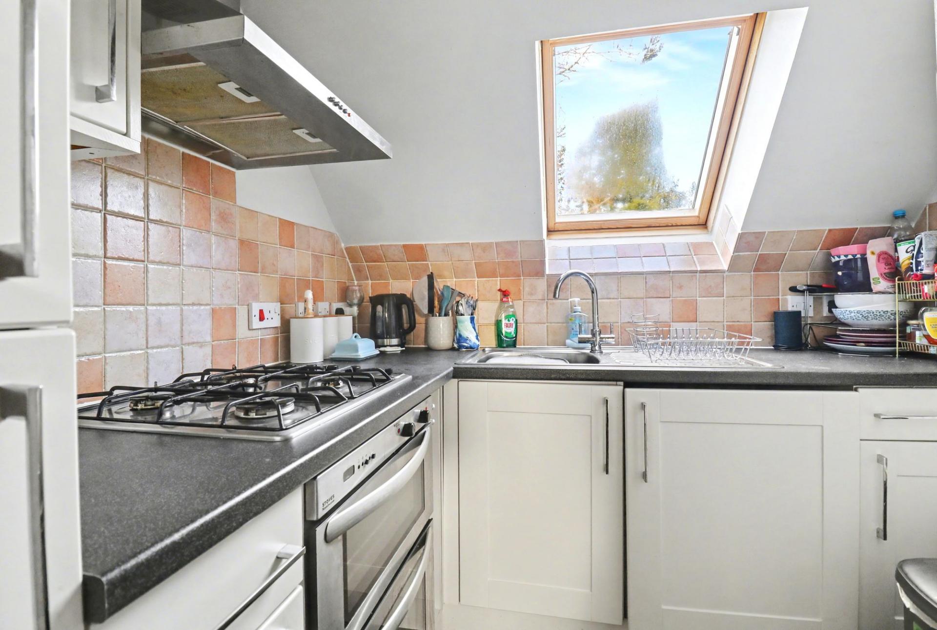 The bright and spacious lounge/diner has windows to the front and side, as well as two skylight windows, allowing for plenty of natural light. The separate kitchen has been fitted with a range of wall and base units with a built-in oven and gas hob with extractor over, as well as an integrated fridge/freezer and washing machine and a skylight window to the rear.