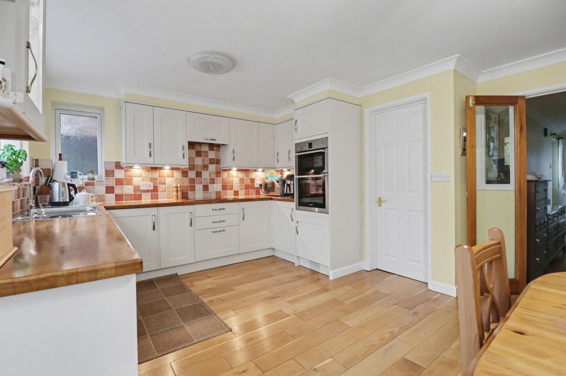 The modern kitchen/diner has been fitted with a range of wall and base units with a built-in double oven and hob with extractor over, as well as an integrated fridge and dishwasher. There are windows to the side and rear and a door leading through to the utility room, which offers further fitted units, a door to the side and space for a washing machine, tumble dryer and free-standing fridge/freezer.