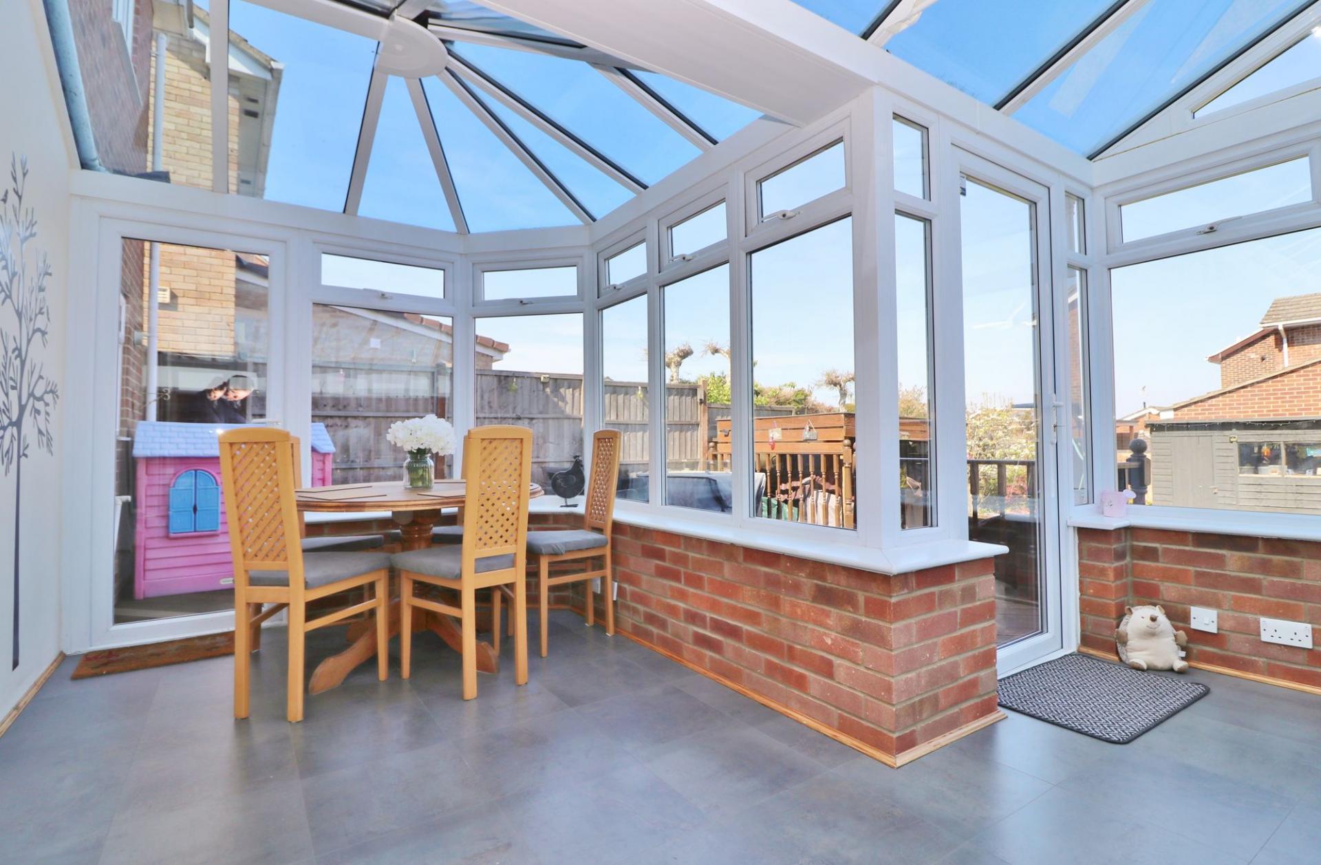 The generous conservatory is currently being used as a family room and has two doors opening onto the decked seating area.