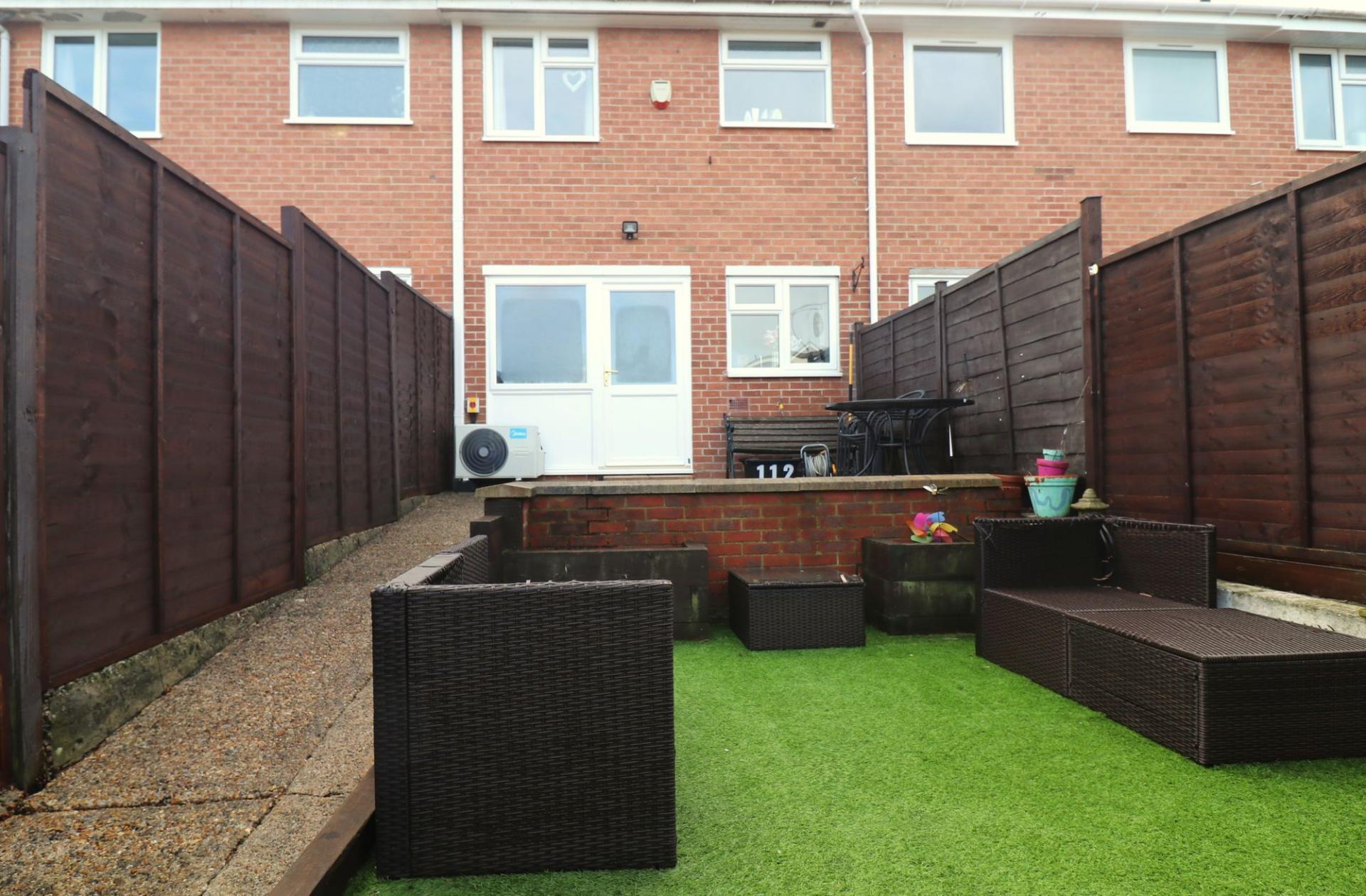 The landscaped rear garden features a paved seating area, artificial lawn and gated, rear pedestrian access leading to the parking space and single garage.