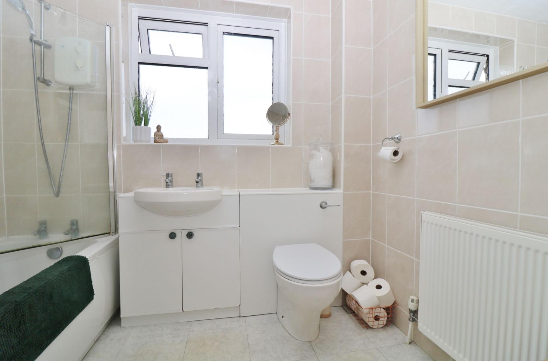 The modern family bathroom comprises a panel enclosed bath with shower and screen over, vanity wash hand basin, WC and a window to the rear.