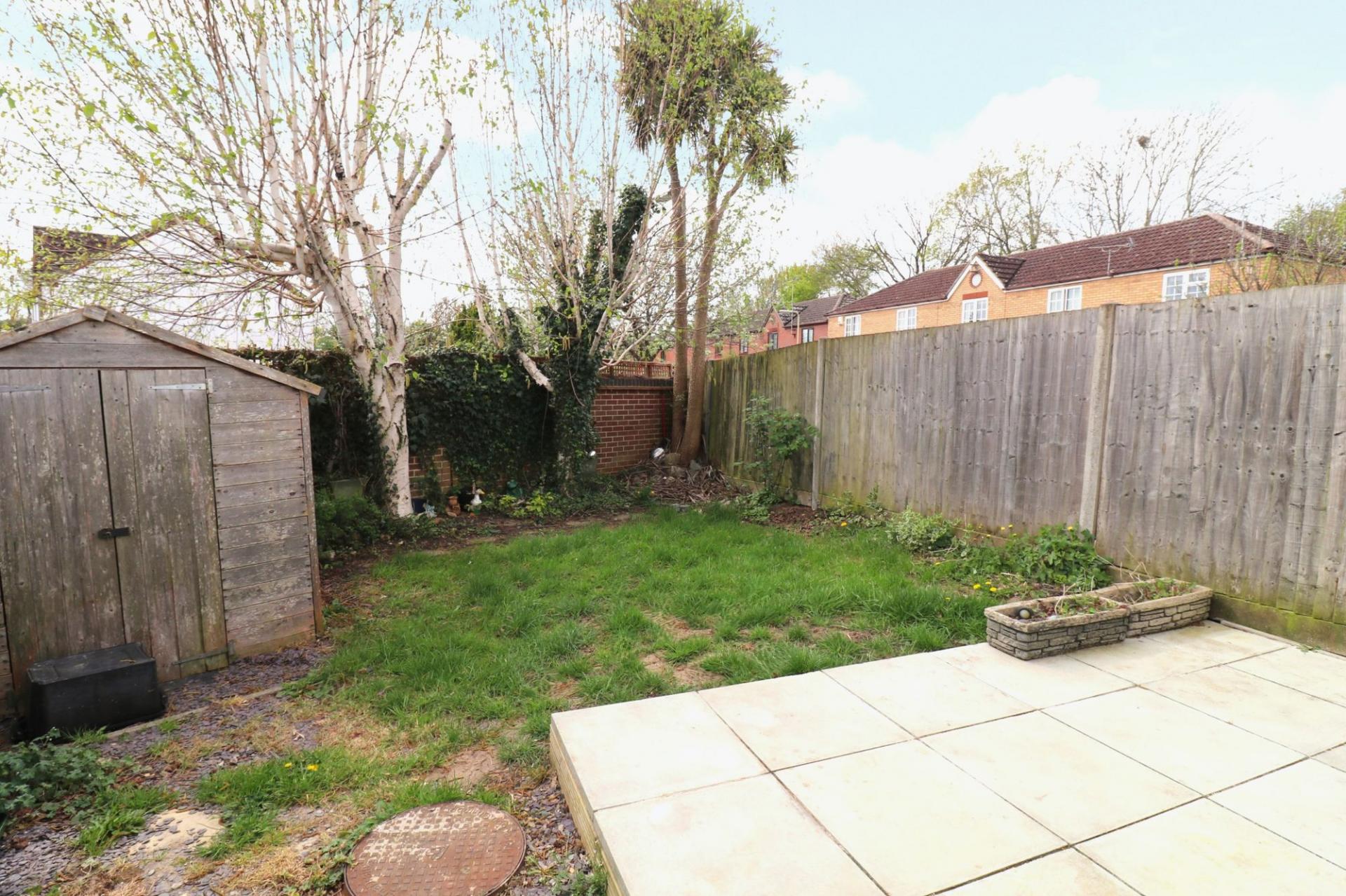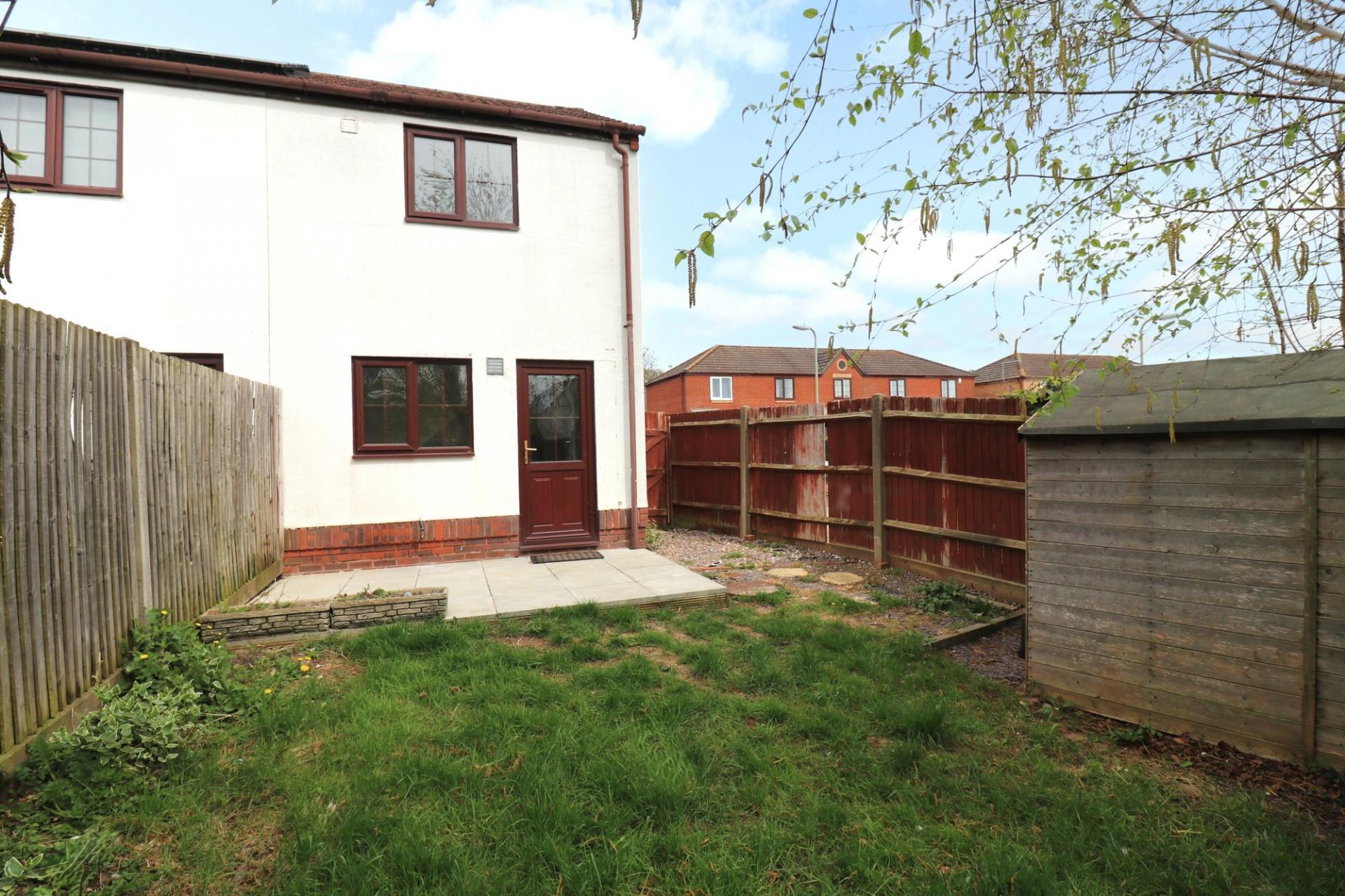 To the front there are two allocated parking spaces. Gated, side access leads round to the rear garden which enjoys a southerly aspect and has a paved seating area, leaving the rest of the garden mainly laid to lawn with a storage shed to one corner.