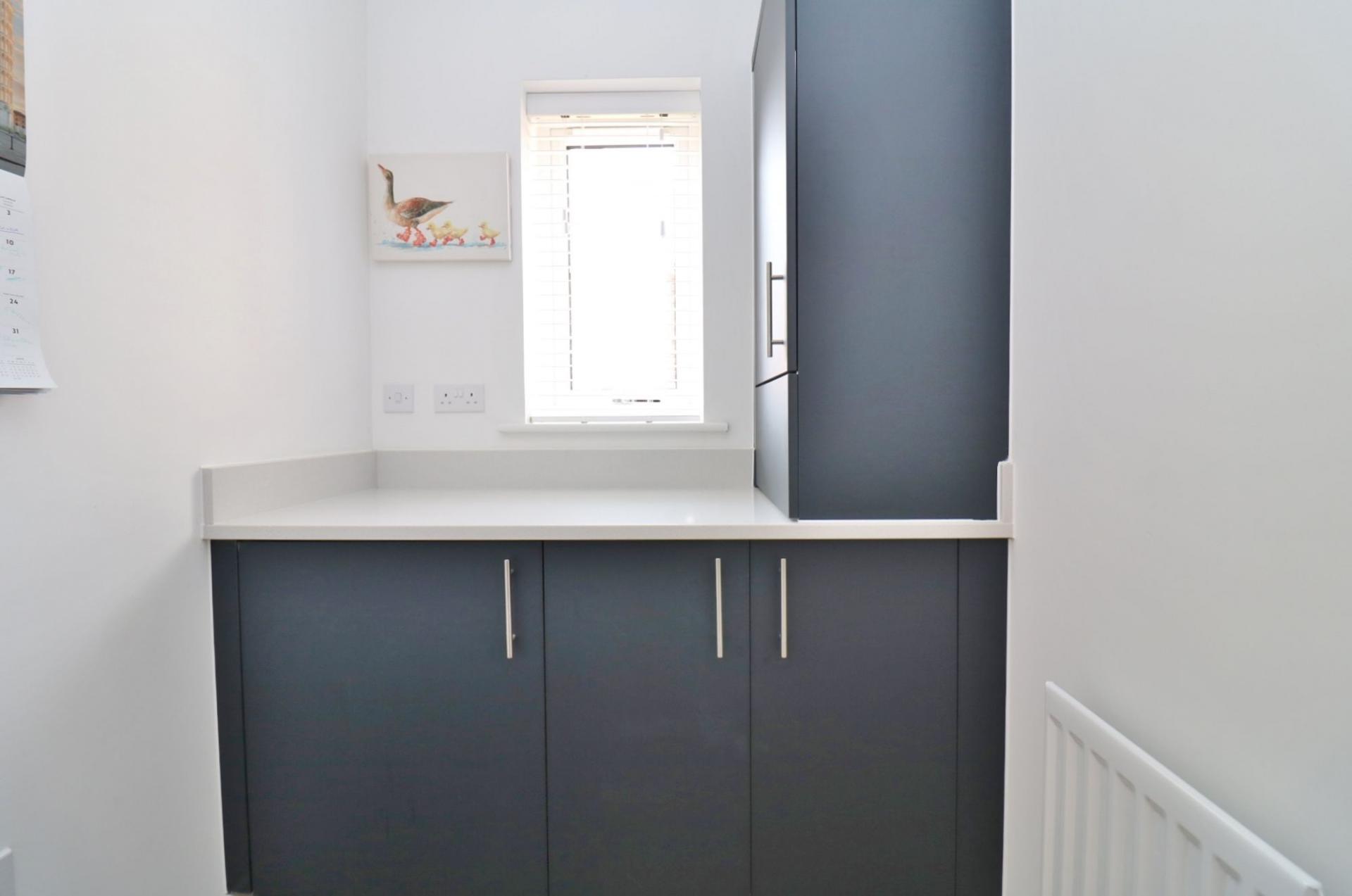 The adjoining utility room has matching fitted units with a Quartz worktop, an integrated washing machine and a window to the front aspect.