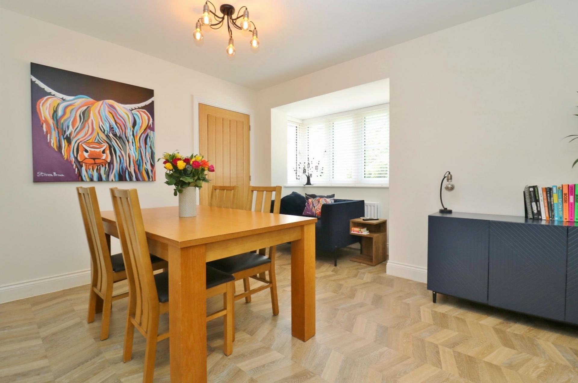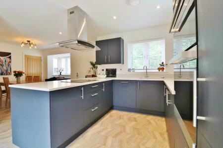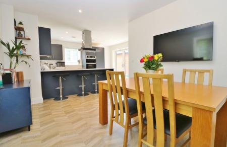 The kitchen has been fitted with a modern range of wall and base units with Quartz worktops, including a breakfast bar, and has a built-in double oven, induction hob with extractor over and integrated appliances including a fridge/freezer and dishwasher. There are windows to the side and rear and the room is open plan to the dining/living area, which has a bay window to the side.