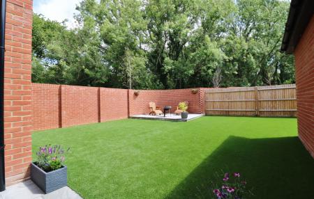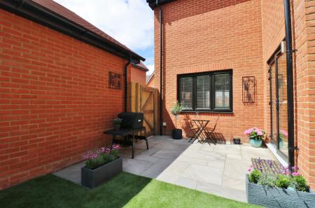 Gated access leads round to the attractive, landscaped rear garden which has two Indian sandstone paved seating areas, one of which is raised to the far corner, capturing the evening sun. The rest of the garden is mainly laid to artificial lawn, which wraps behind the garage.