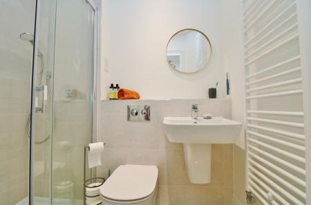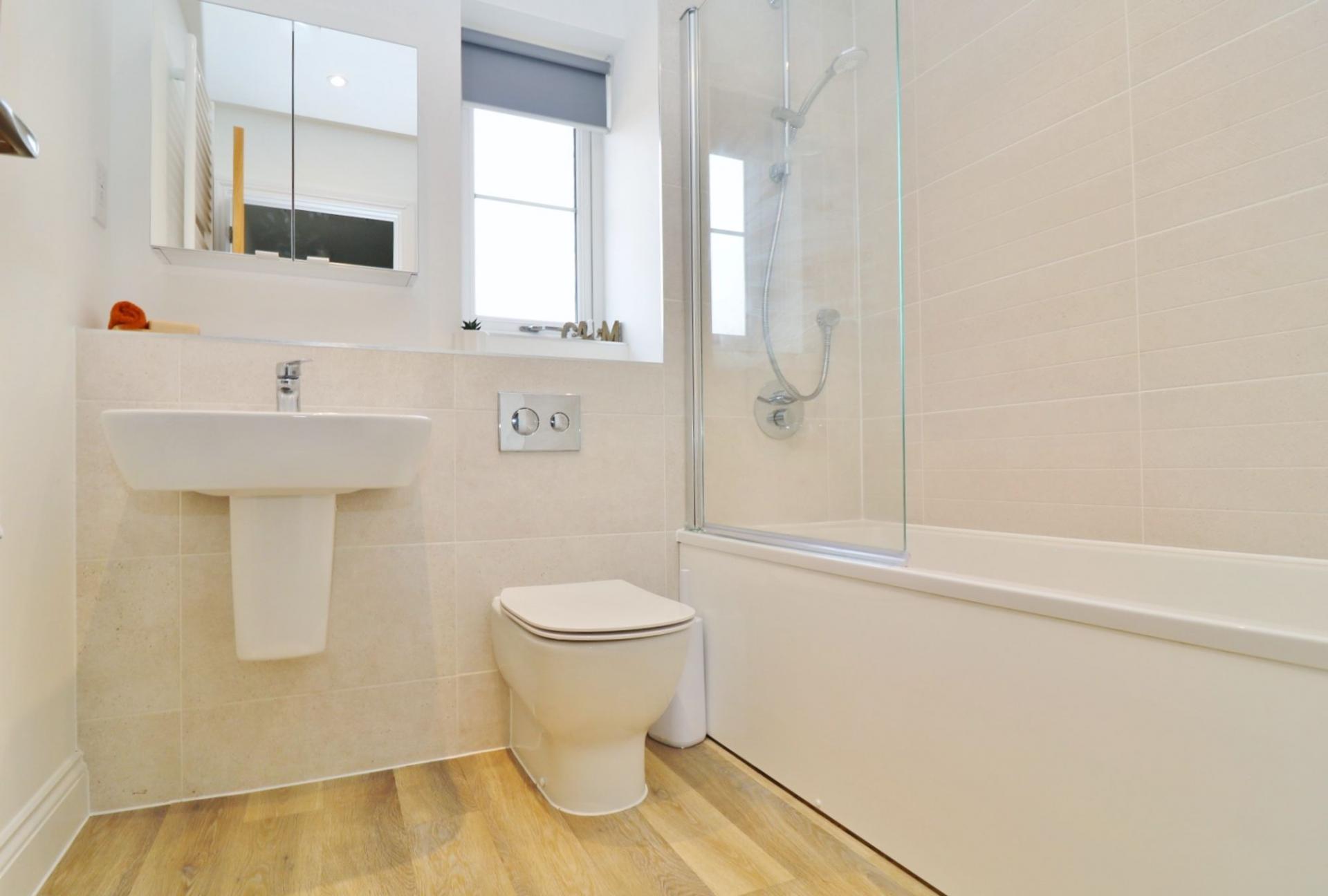 The modern family bathroom has a panel enclosed bath with shower and screen over, wash hand basin, WC, heated towel rail and a window to the front.