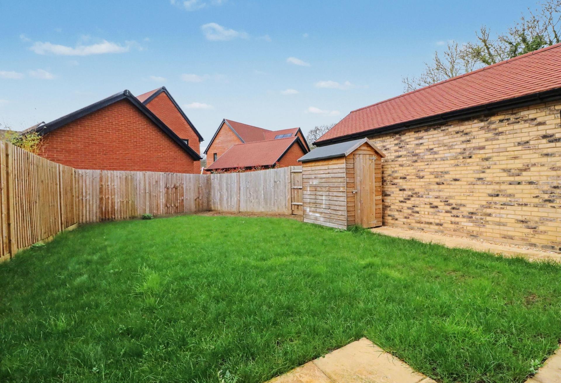 Parking for two vehicles is located to the side of the property where a pedestrian gate gives access to the rear garden, where there is a patio area, leaving the rest of the garden mainly laid to lawn with a storage shed to one side.