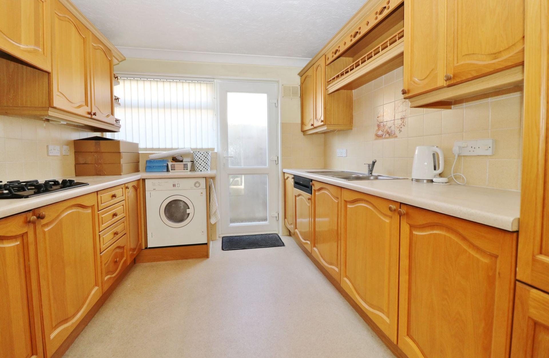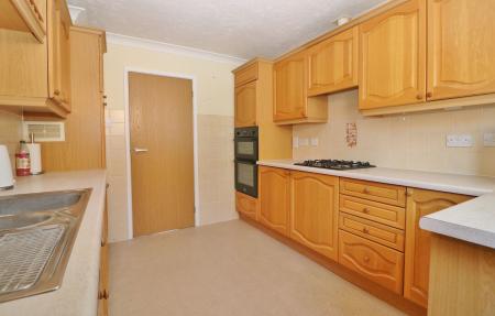 The kitchen has a window and door to the side and has been fitted with a range of wall and base units with a built-in double oven and gas hob with extractor over and integrated appliances including a fridge, dishwasher, washing machine and tumble dryer.