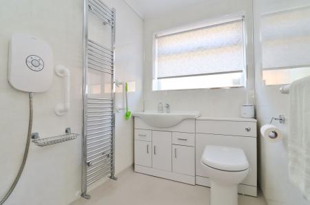 The modern shower room comprises a wall-mounted electric shower, vanity wash hand basin, WC, a heated towel rail and a window to the side.