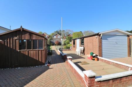 The well-maintained rear garden has two paved seating areas and a storage shed to one side, leaving the rest of the garden mainly laid to lawn with attractive, planted borders.