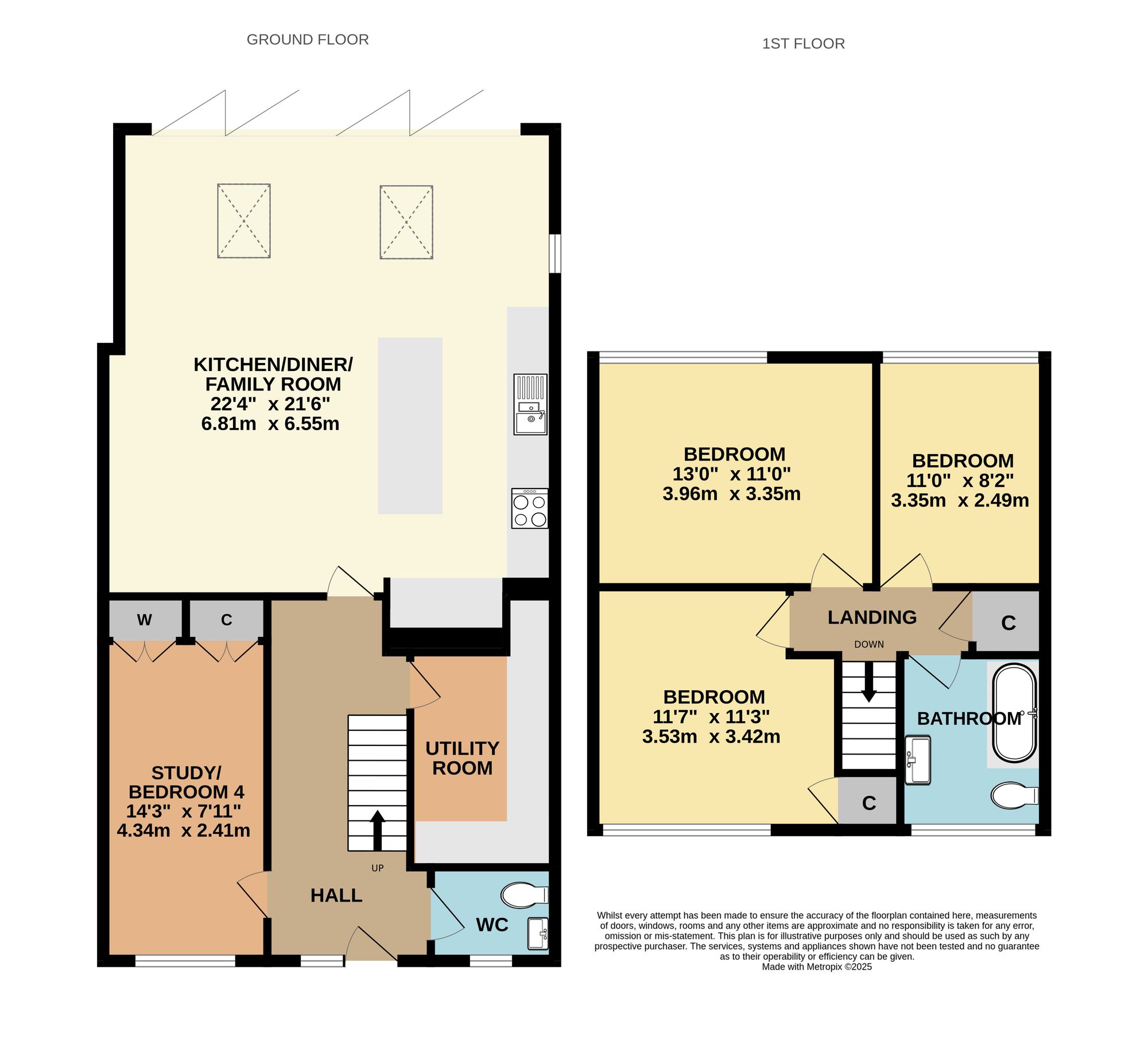The entrance hall has stairs to the first floor and doors through to all ground floor rooms including the modern WC which has a window to the front. The study/fourth bedroom also faces the front of the property and has a fitted wardrobe and cupboard.