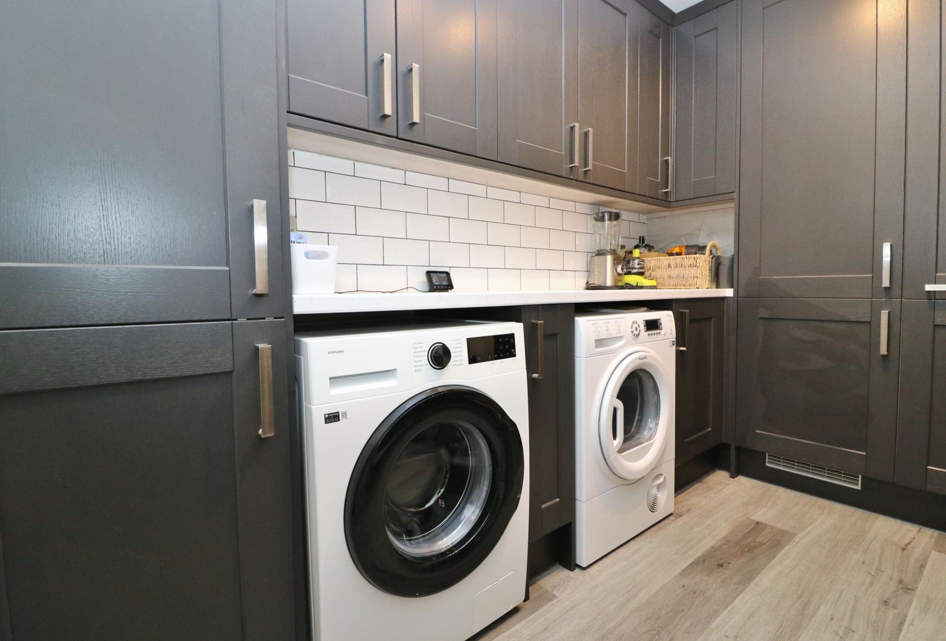 The utility room offers further matching units and appliance space for a washing machine and tumble dryer.