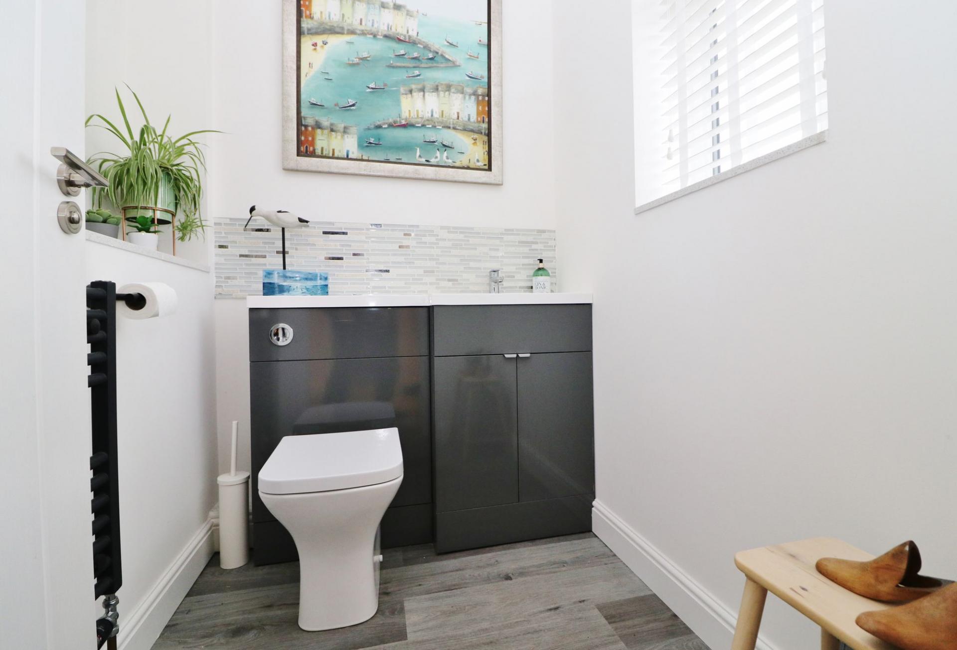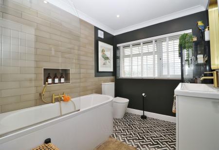 The beautifully appointed family bathroom comprises a panel enclosed bath with shower and screen over, vanity wash hand basin, WC, complementary tiling and a window to the front.