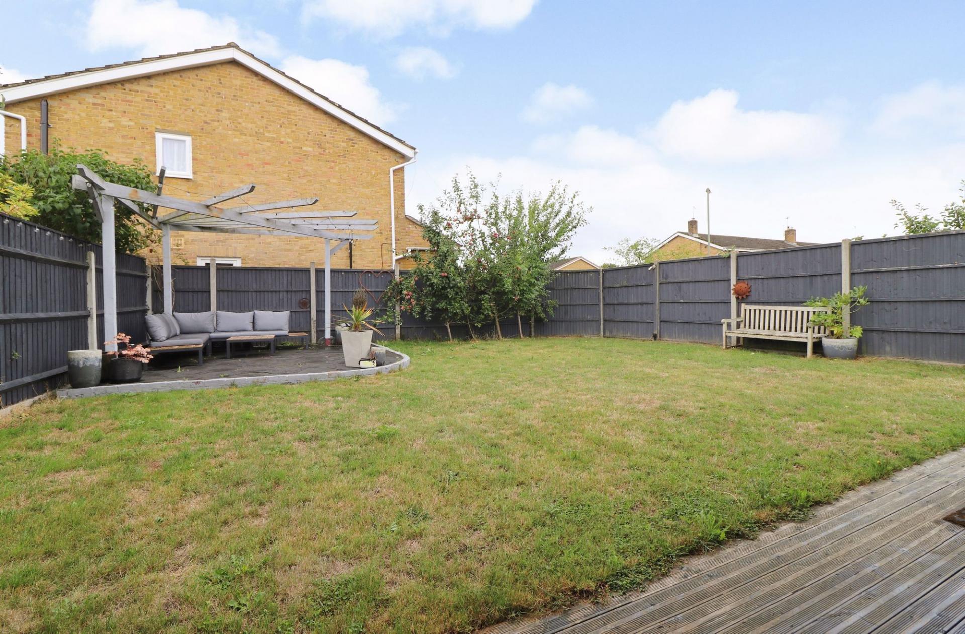 To the front there is a lawned garden and driveway parking for two cars. Gated side access leads round to the rear garden, which enjoys a south easterly aspect and has a paved patio area, leaving the rest of the garden mainly laid to lawn with an additional seating area to one corner with a pergola above. To the side of the property there are two storage sheds.