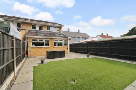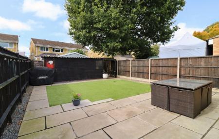 The attractive rear garden has been landscaped with a paved seating area leaving the rest of the garden laid to artificial lawn with a storage shed at the end.