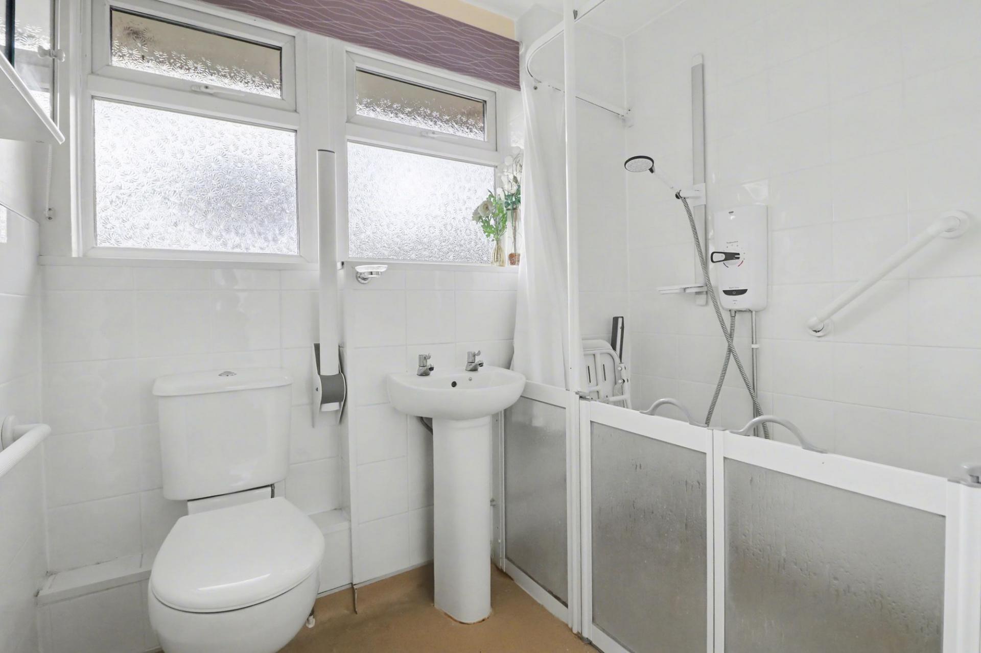 The shower room comprises a walk-in shower cubicle, wash hand basin, WC and a window to the rear.