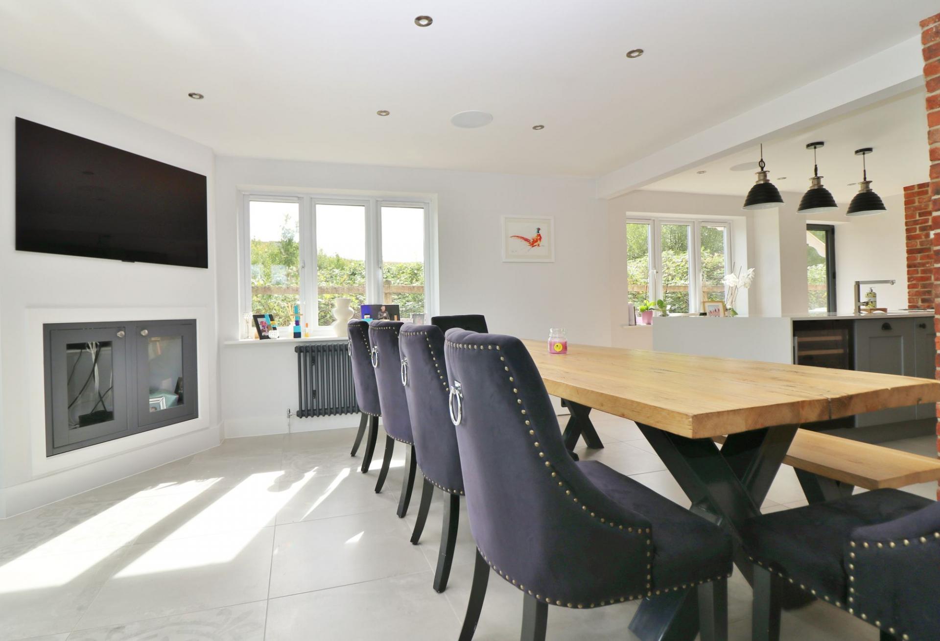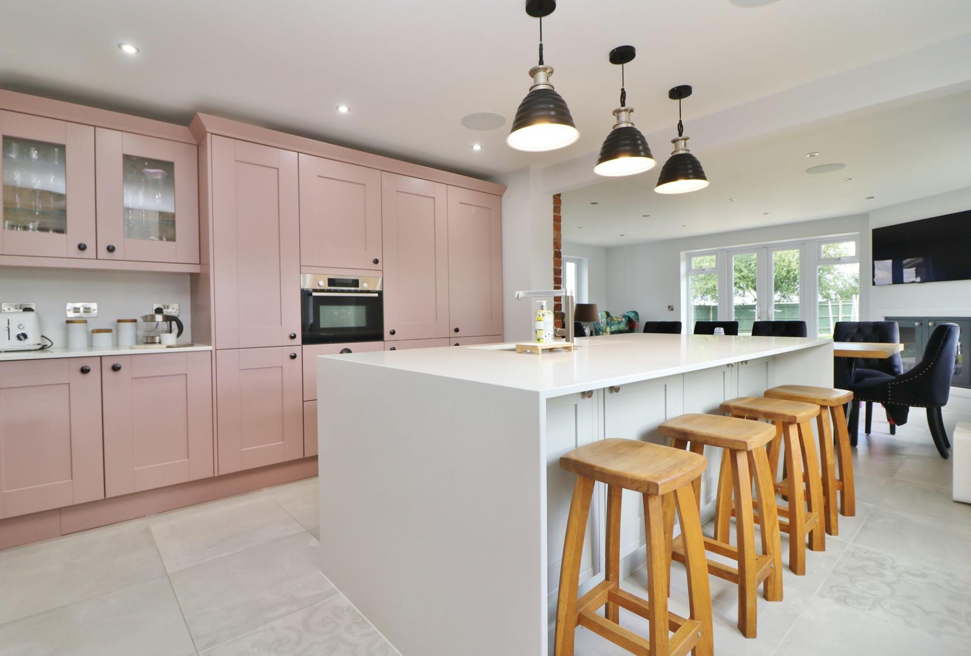 The heart of the home has to be the beautiful, open plan kitchen/dining/family room which enjoys a triple aspect with French doors opening out to the rear garden and features tiled flooring, spotlights and ceiling speakers throughout.