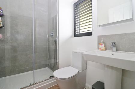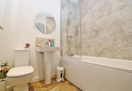 The modern family bathroom comprises a panel enclosed bath with shower and screen over, wash hand basin, WC and a window to the rear.