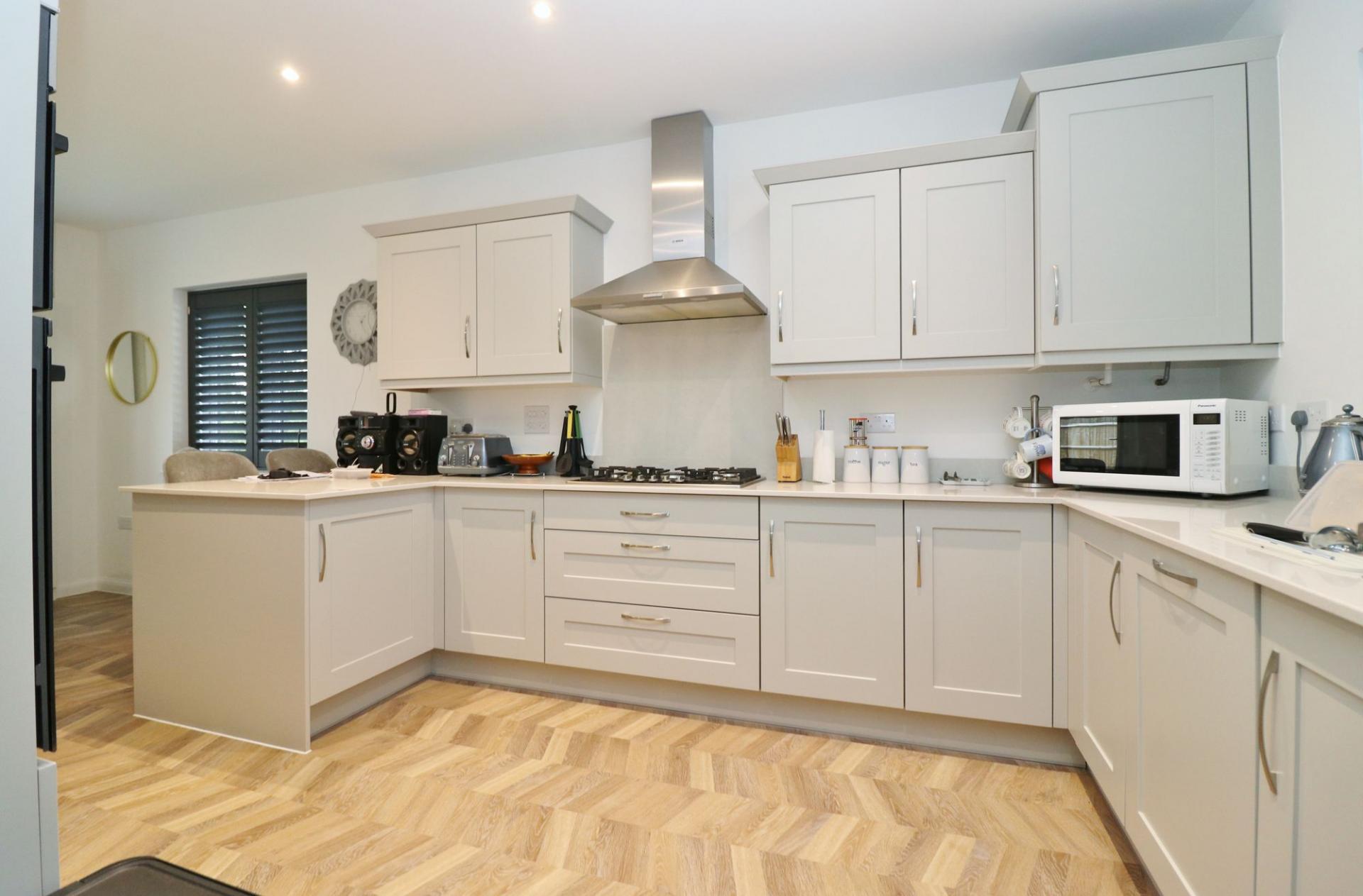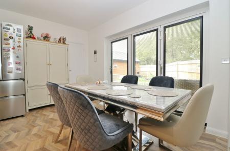 The impressive kitchen/diner enjoys a triple aspect with bi-folding doors from the dining area opening out to the rear garden and has a large storage cupboard to one side. The kitchen has been fitted with a modern range of shaker style wall and base units with a built-in double oven, gas hob with extractor over, an integrated fridge/freezer, dishwasher and washer dryer, as well as space for an American style fridge/freezer.