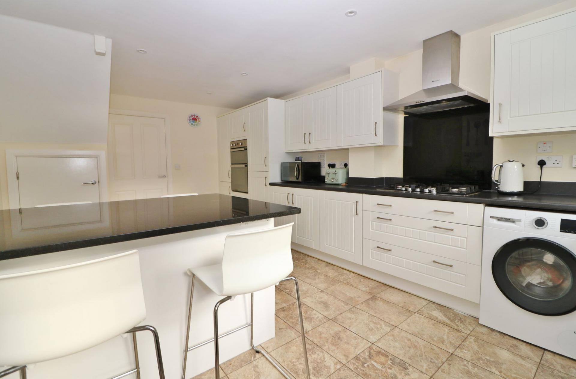 The good-sized kitchen/breakfast room has been fitted with a modern range of shaker style wall and base units with a built-in double oven and a five ring gas hob with extractor over, as well as an integrated fridge/freezer and dishwasher. There is a fitted breakfast bar to one side, space for a washing machine, a door to the dining area and a window and door leading out to the garden.