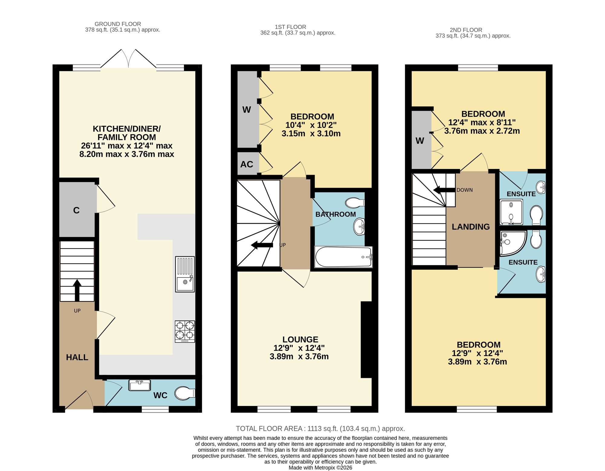 The ground floor features an impressive, 26ft kitchen/dining/family room with French doors to the rear garden, as well as a WC. On the first floor, there is a generous sized lounge, a double bedroom and modern family bathroom. On the top floor there are two further double bedrooms, both with well-appointed, en-suite shower rooms.