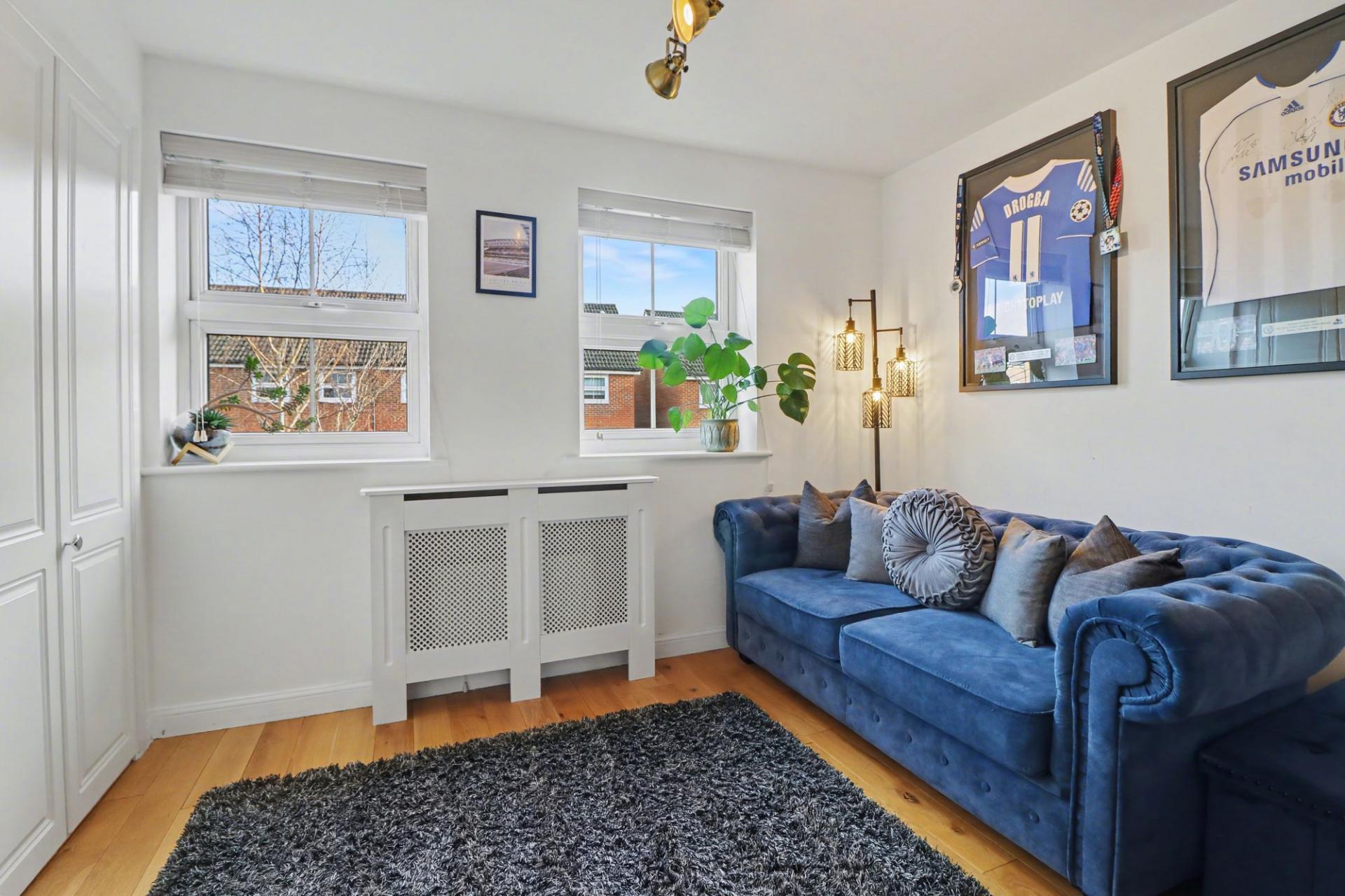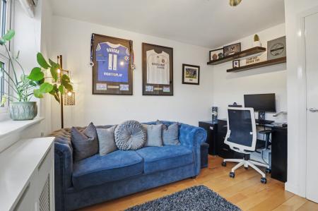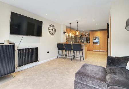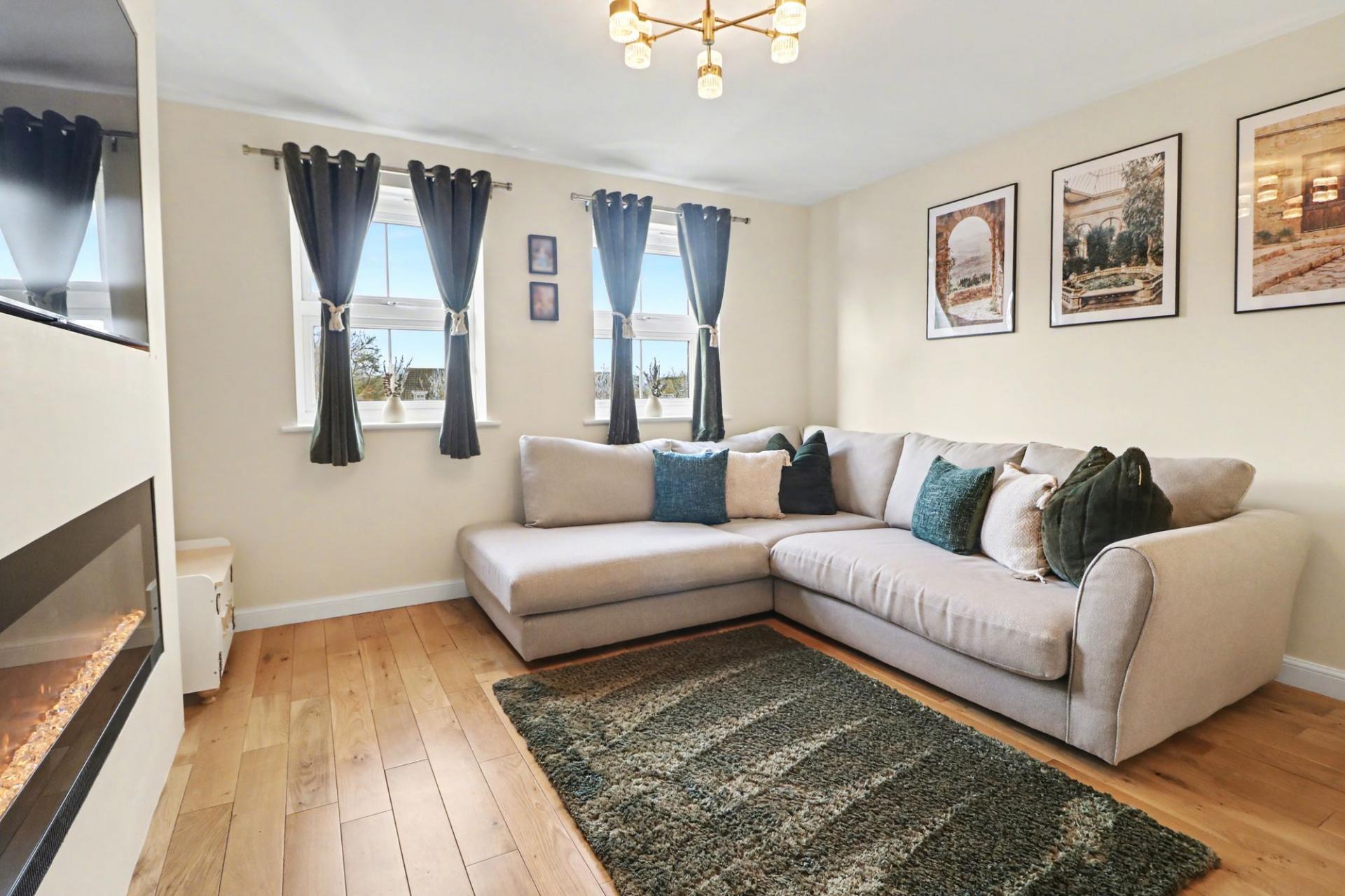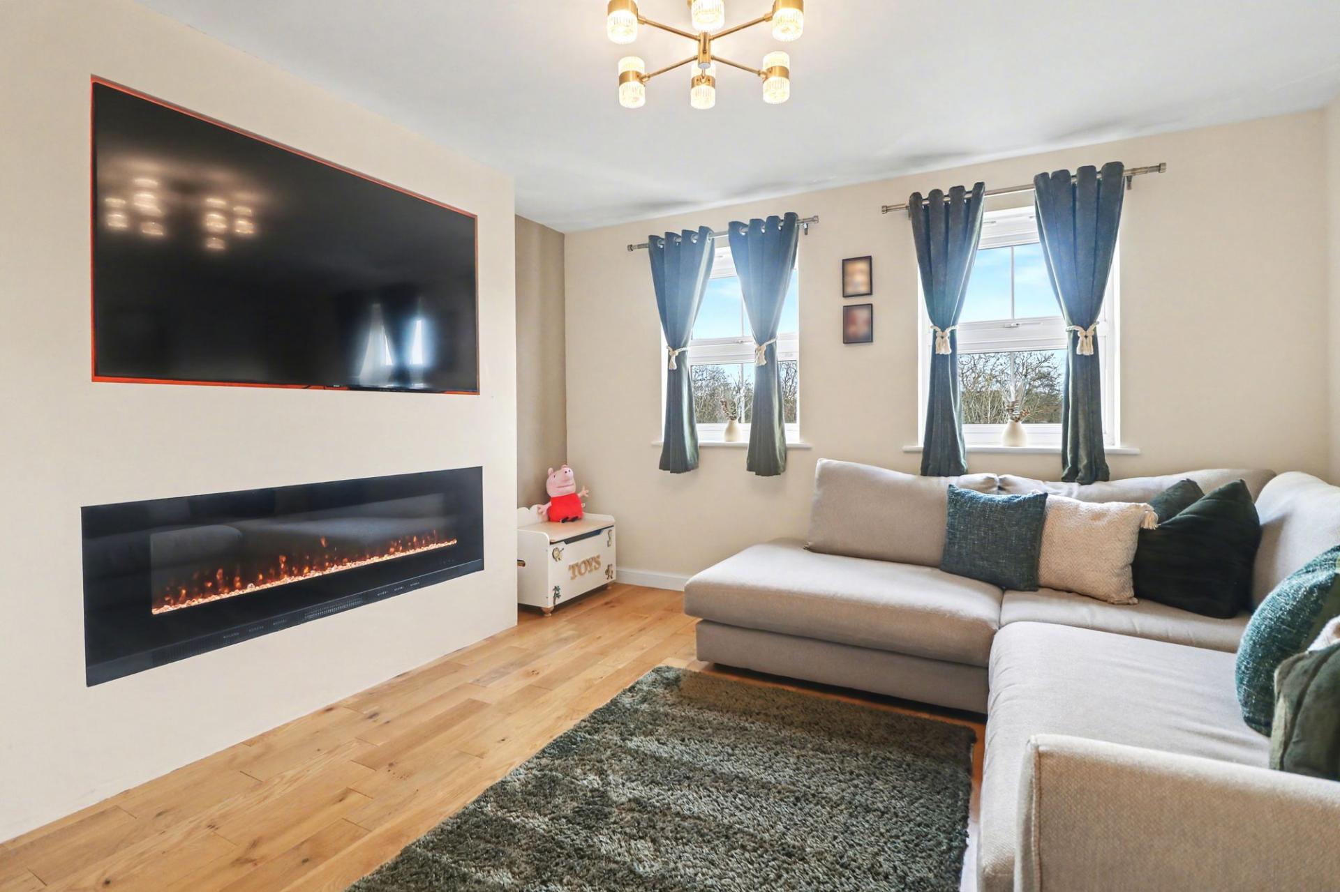 The bright and spacious living room enjoys two windows to the front aspect and features a media wall with an inset electric fire and recess space for a TV.