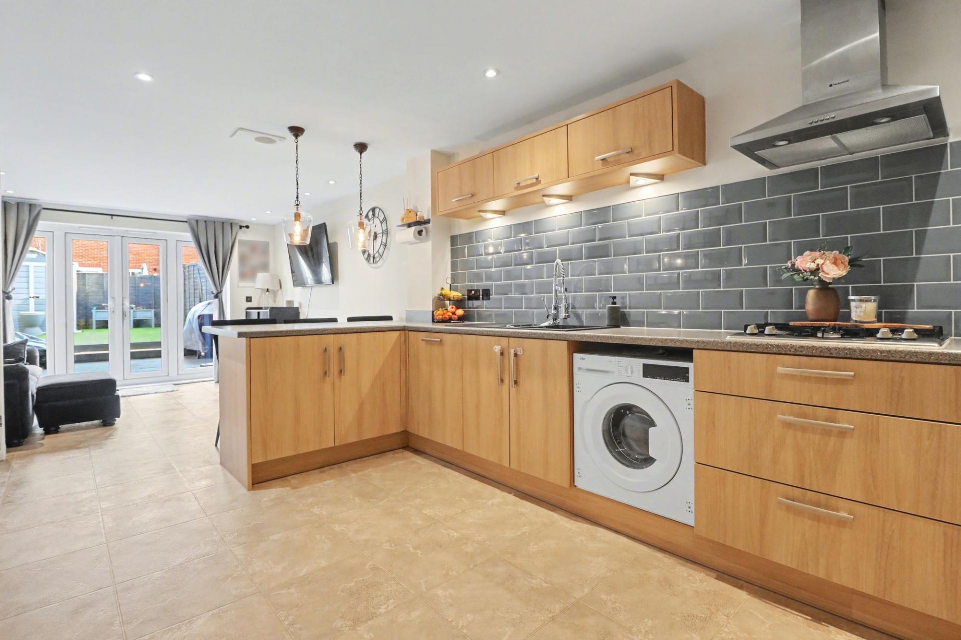 The wonderful, open plan kitchen/diner/family room has been fitted with a modern range of wall and base units with a built-in double oven and gas hob with extractor over, as well as an integrated fridge/freezer, dishwasher and washing machine. There is a useful breakfast bar, a large, built-in storage cupboard and French doors from the family area opening out to the rear garden.